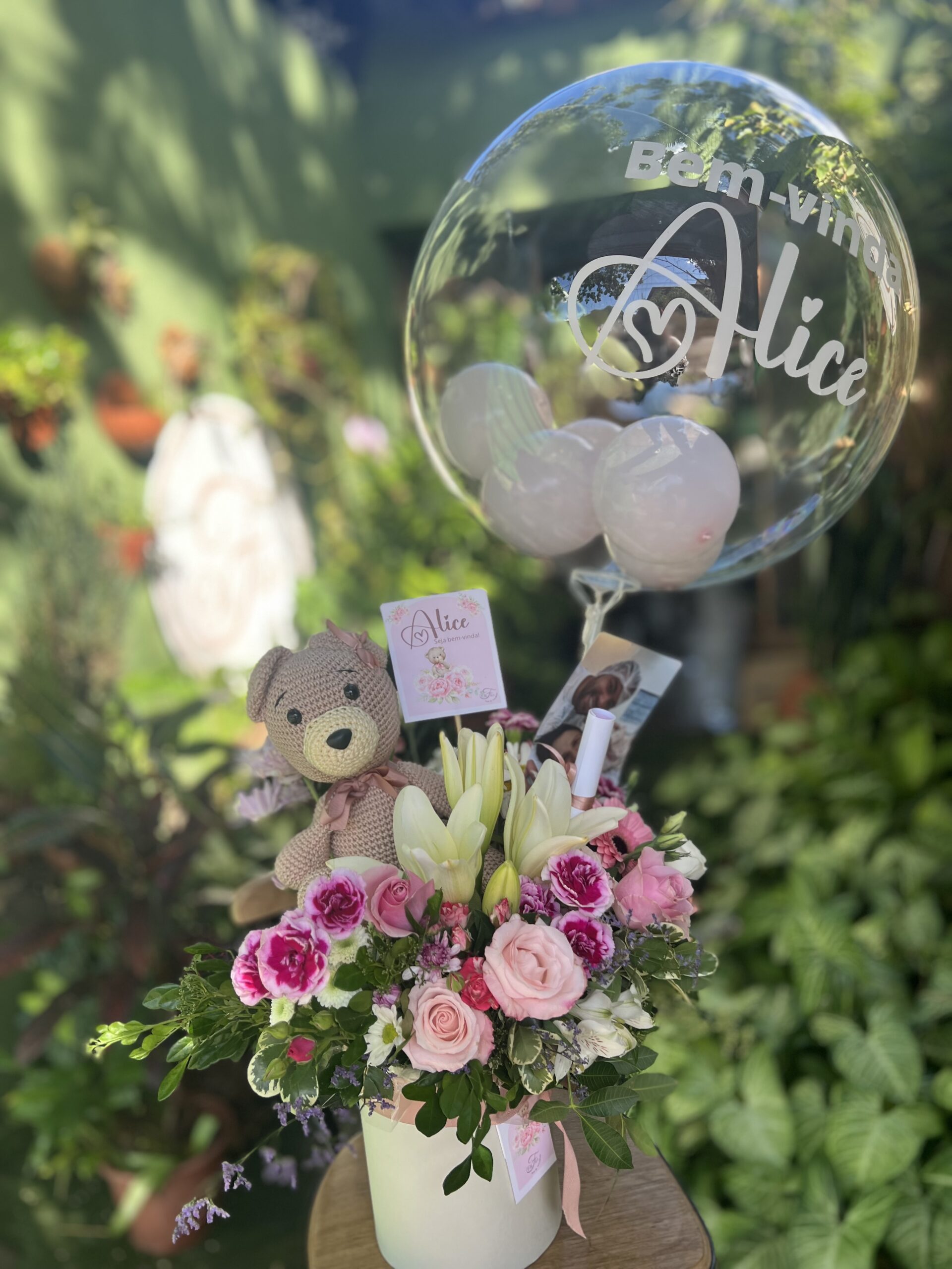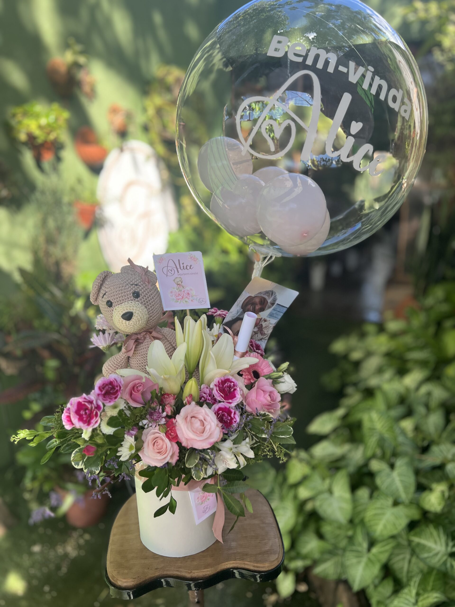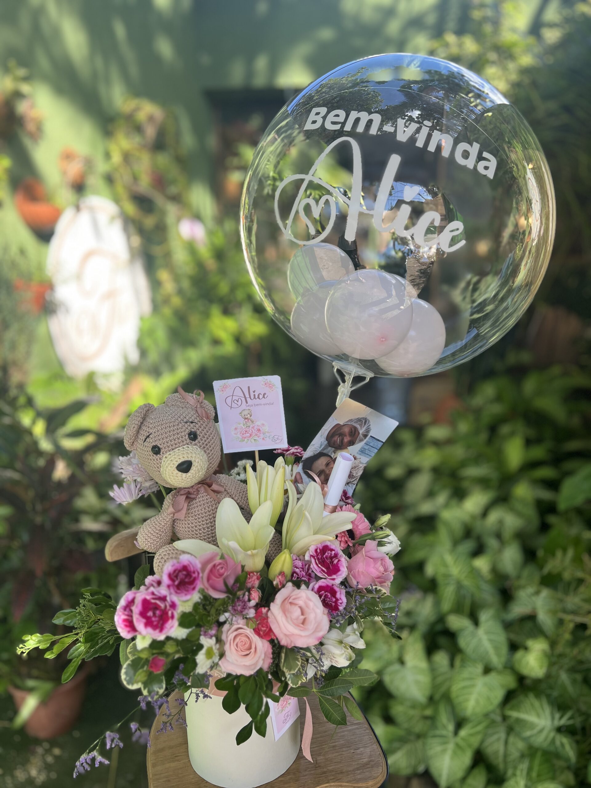 Flores frescas da semana, escolhidas com delicadeza, acompanham um adorável urso amigurumi, feito à mão com todo o cuidado. Para um toque especial, um balão bubble personalizado com o nome do bebê e duas fotos memoráveis, eternizando os primeiros momentos.