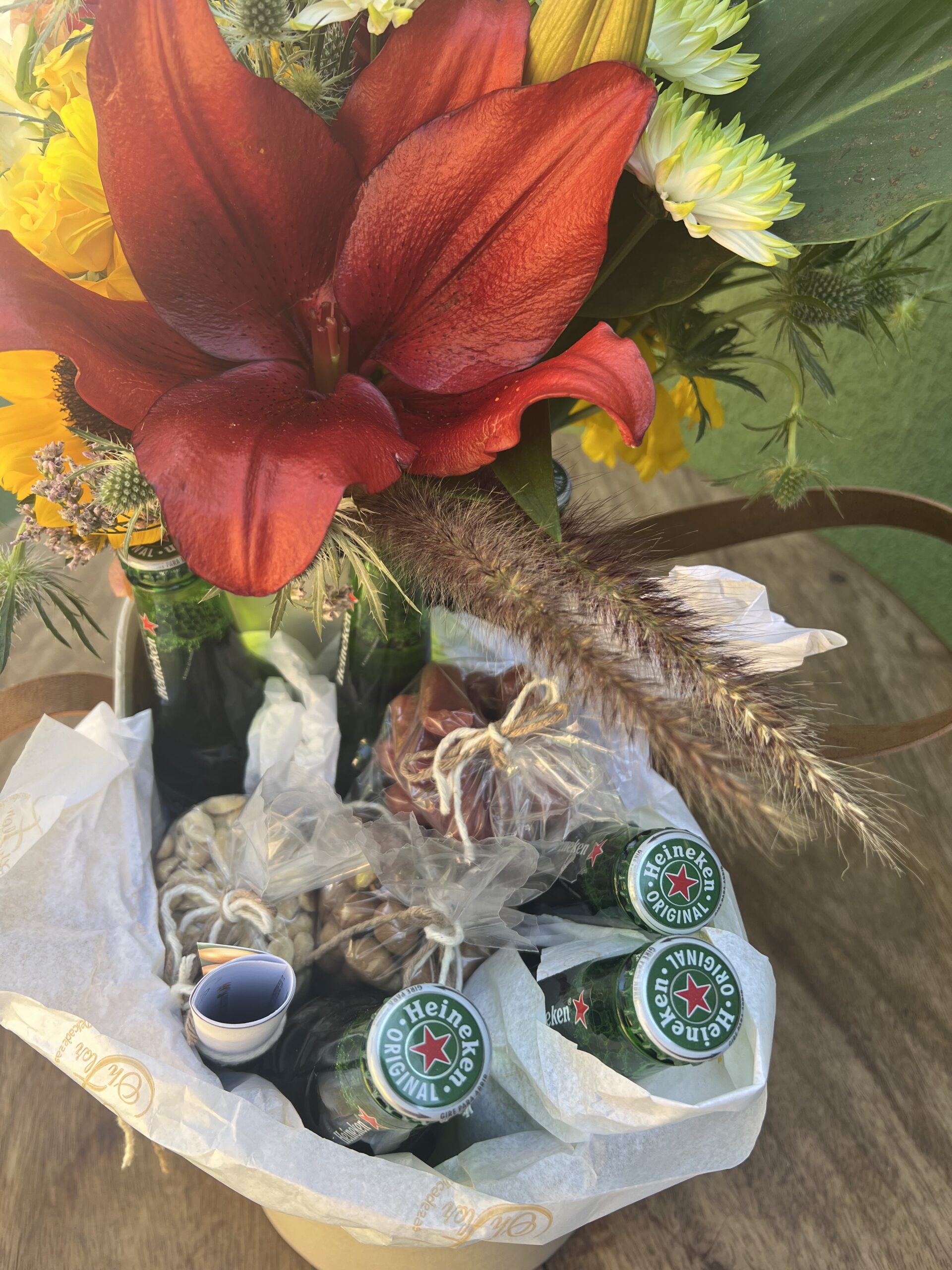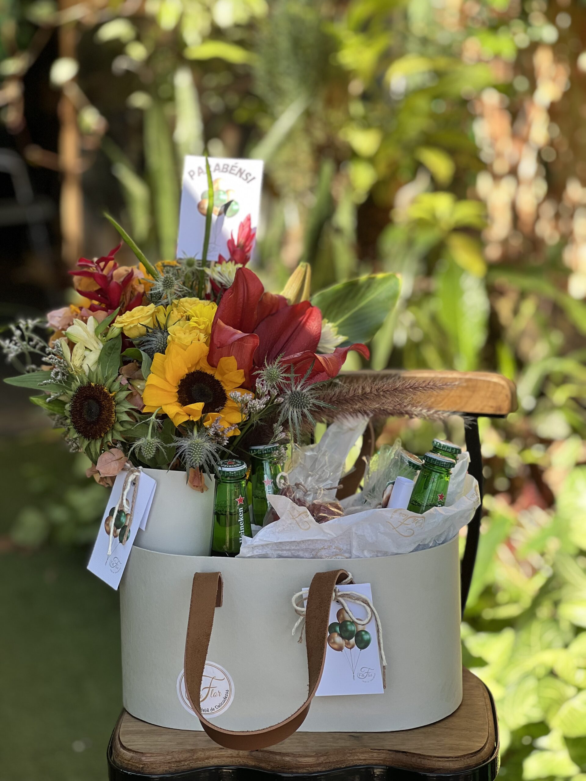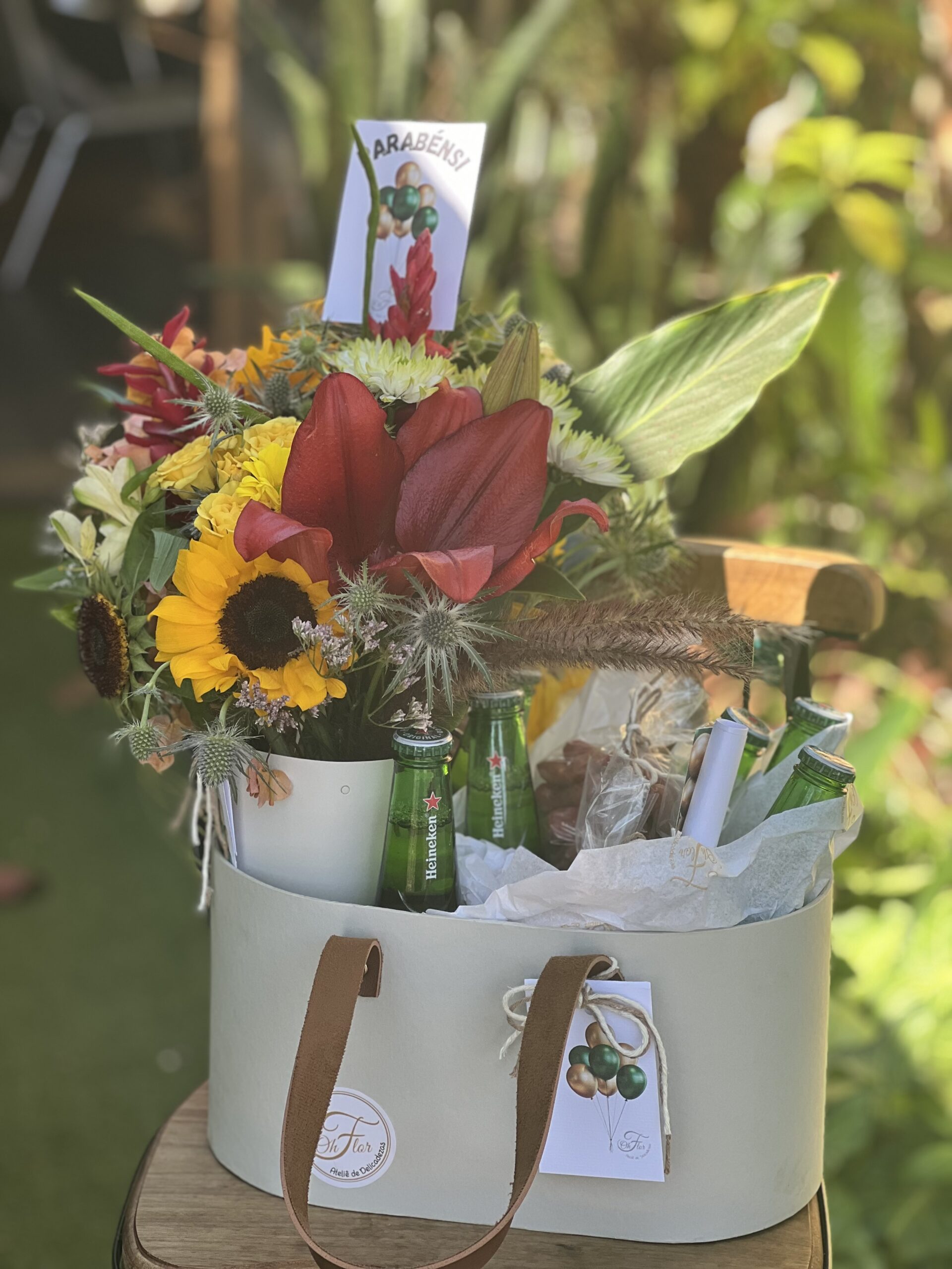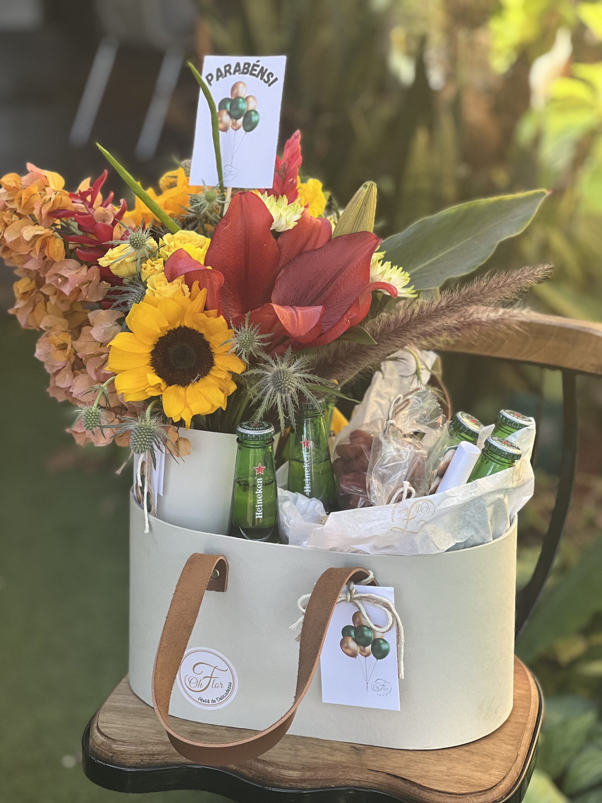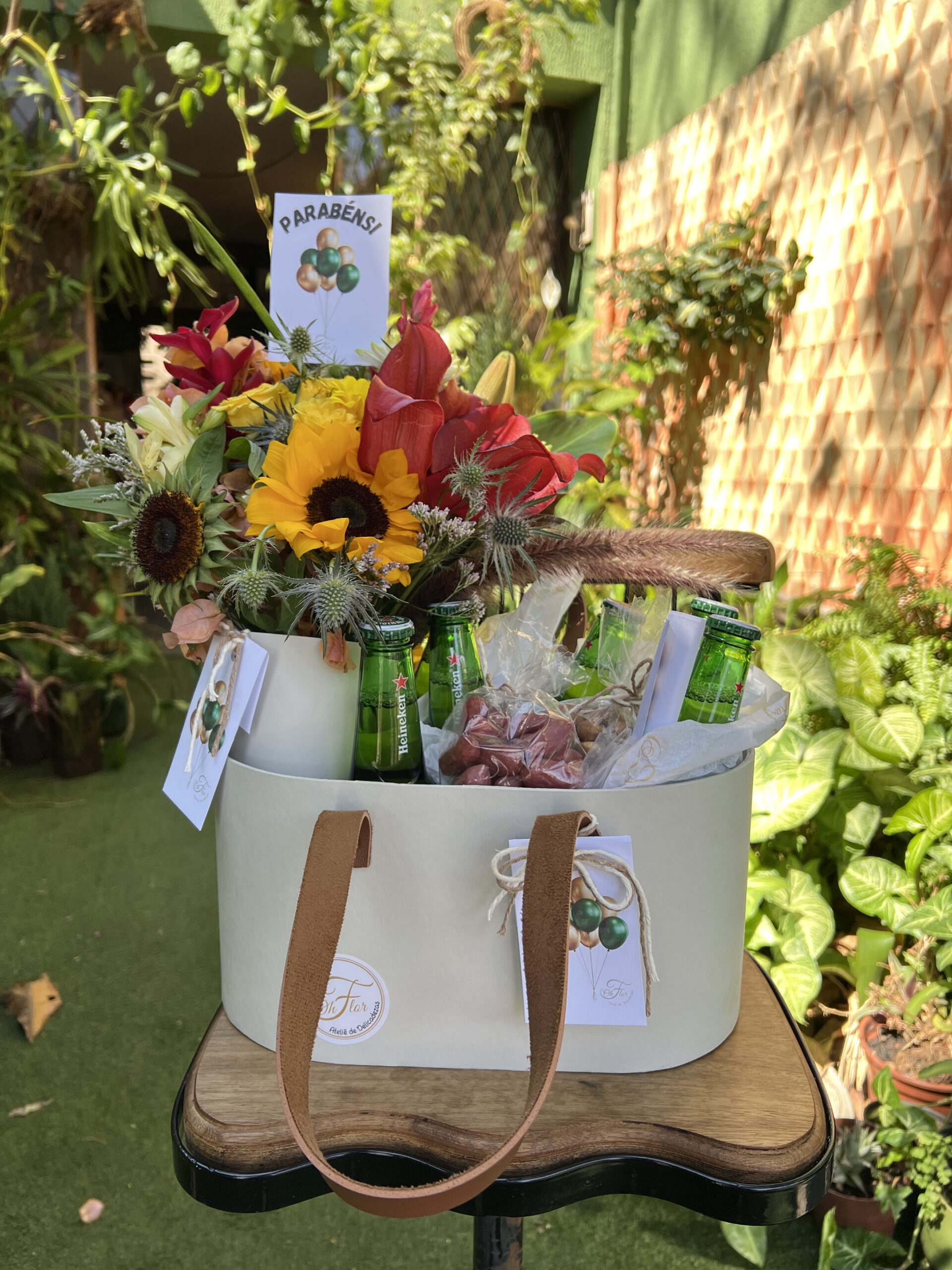 Desfrute de um final de semana incrível com nosso box repleto de delícias! Flores frescas da estação, 6 cervejas long neck, mini salaminho, amendoim japonês e salgado sem casca, além de uma linda papelaria. Tudo isso com a qualidade e carinho do Oh Flor Ateliê de Delicadezas.