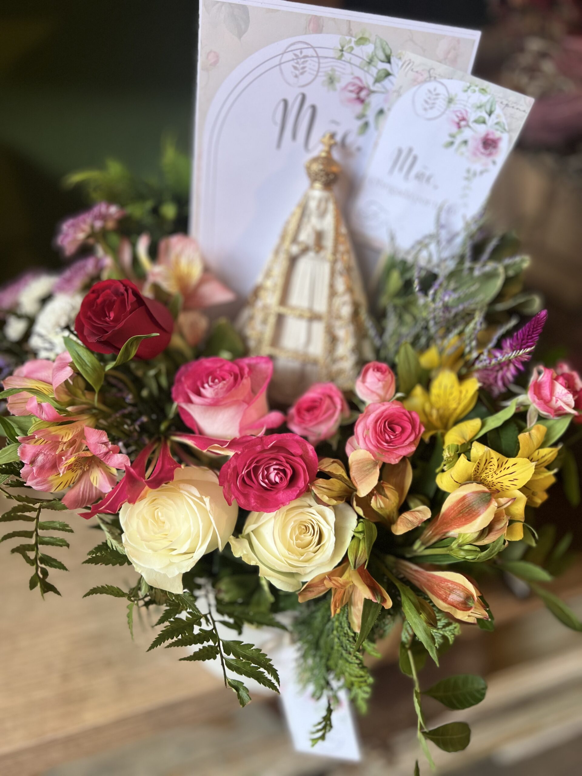 - Papelaria completa: Um cartão com mensagem personalizada e um mini livreto com a história da Nossa Senhora Aparecida completam a experiência.