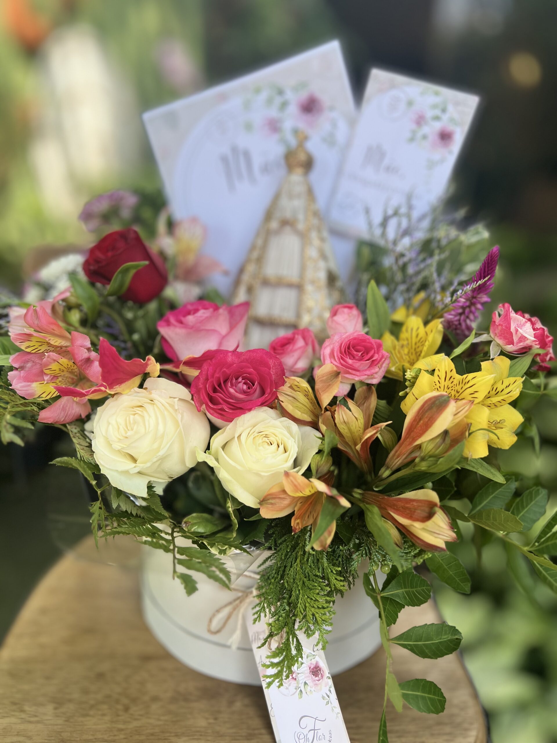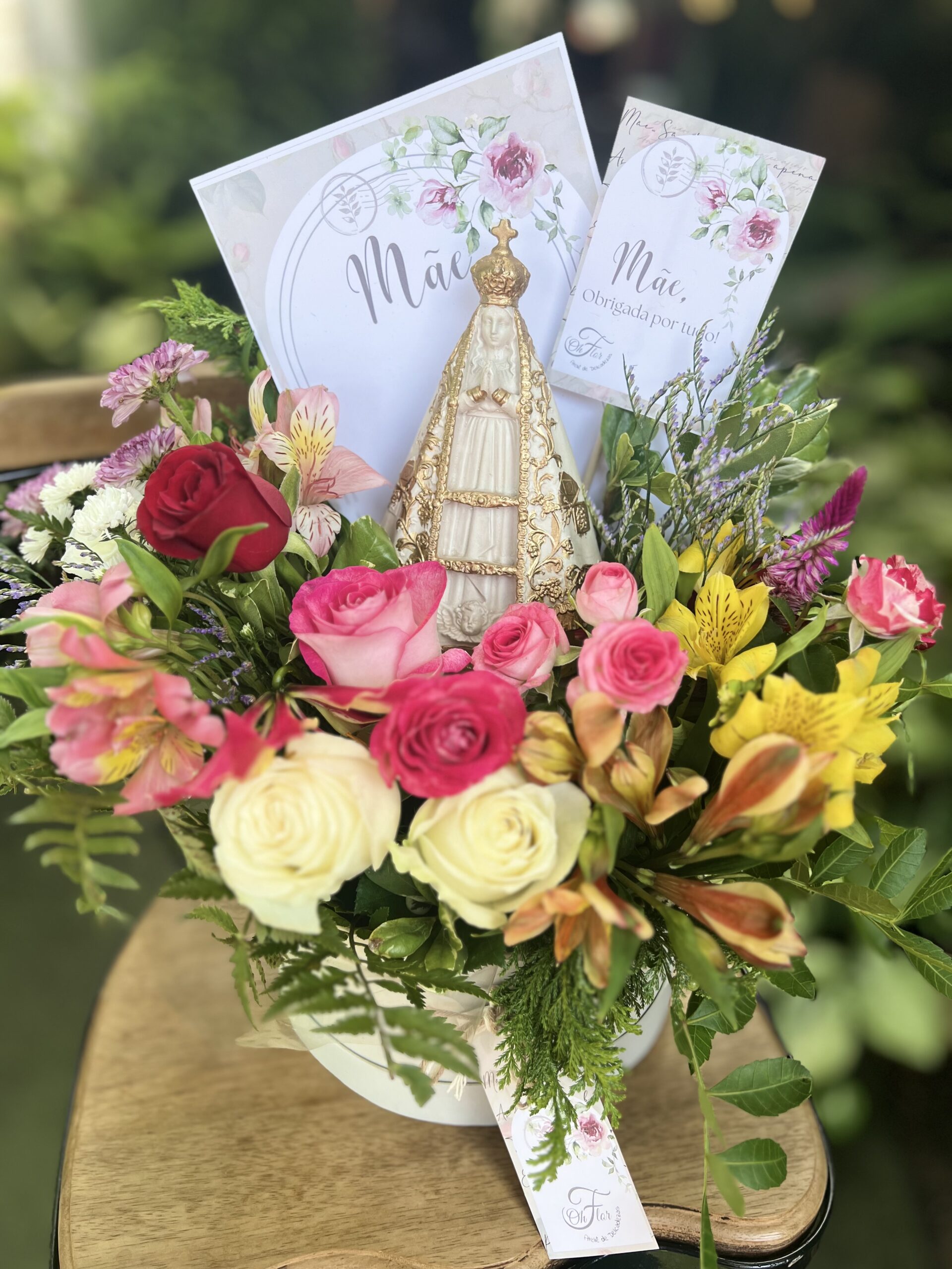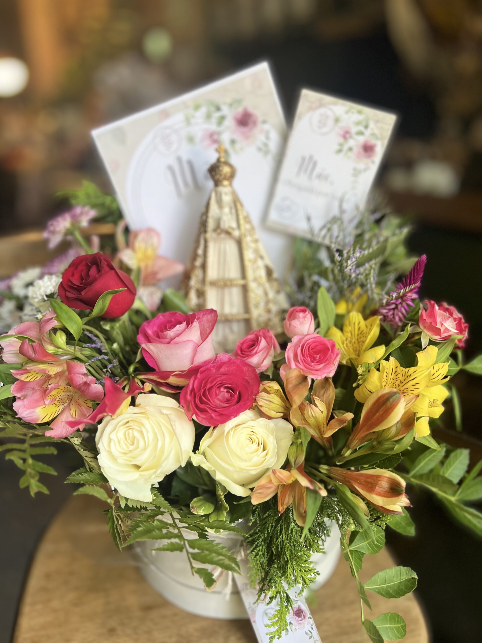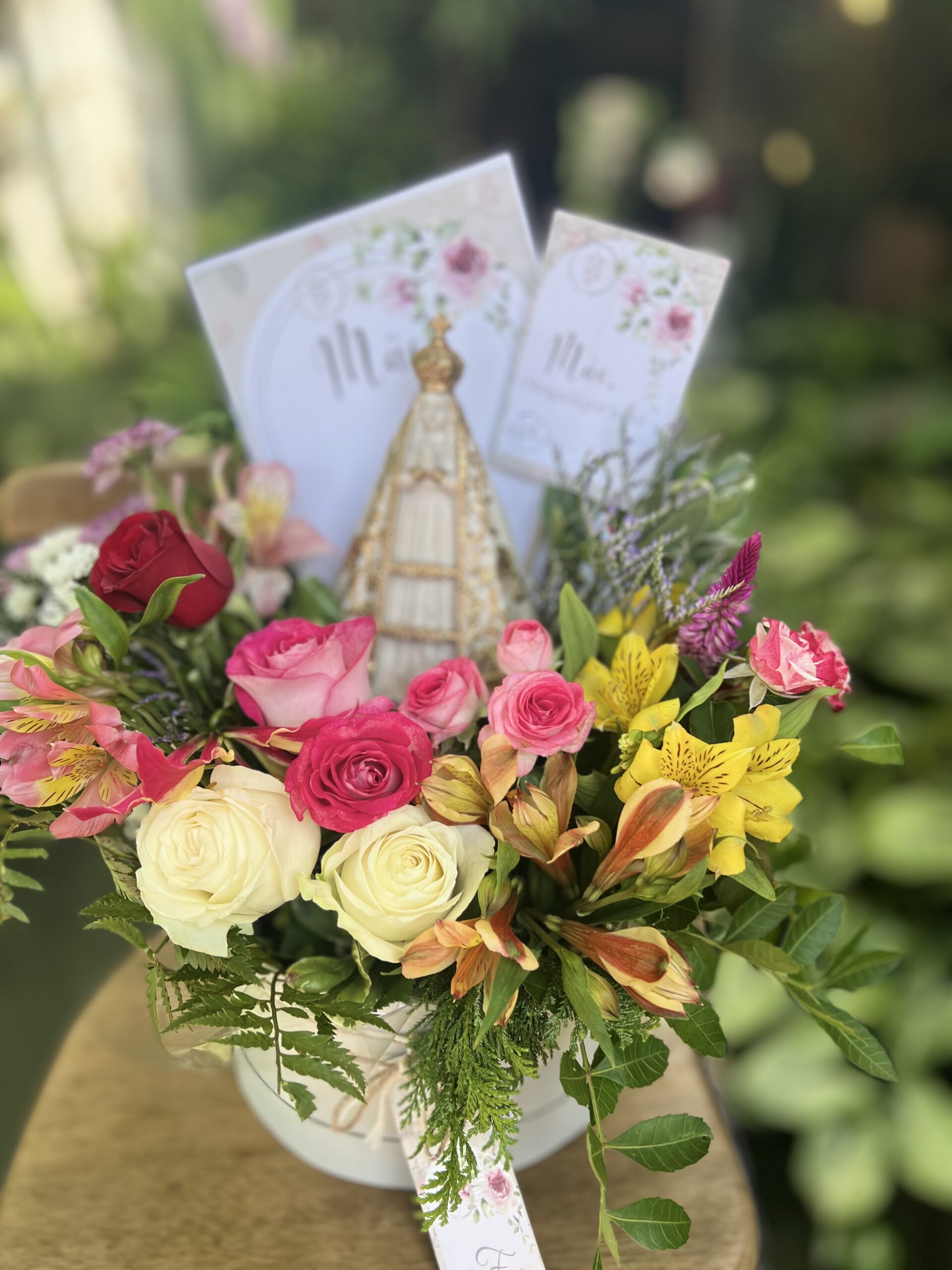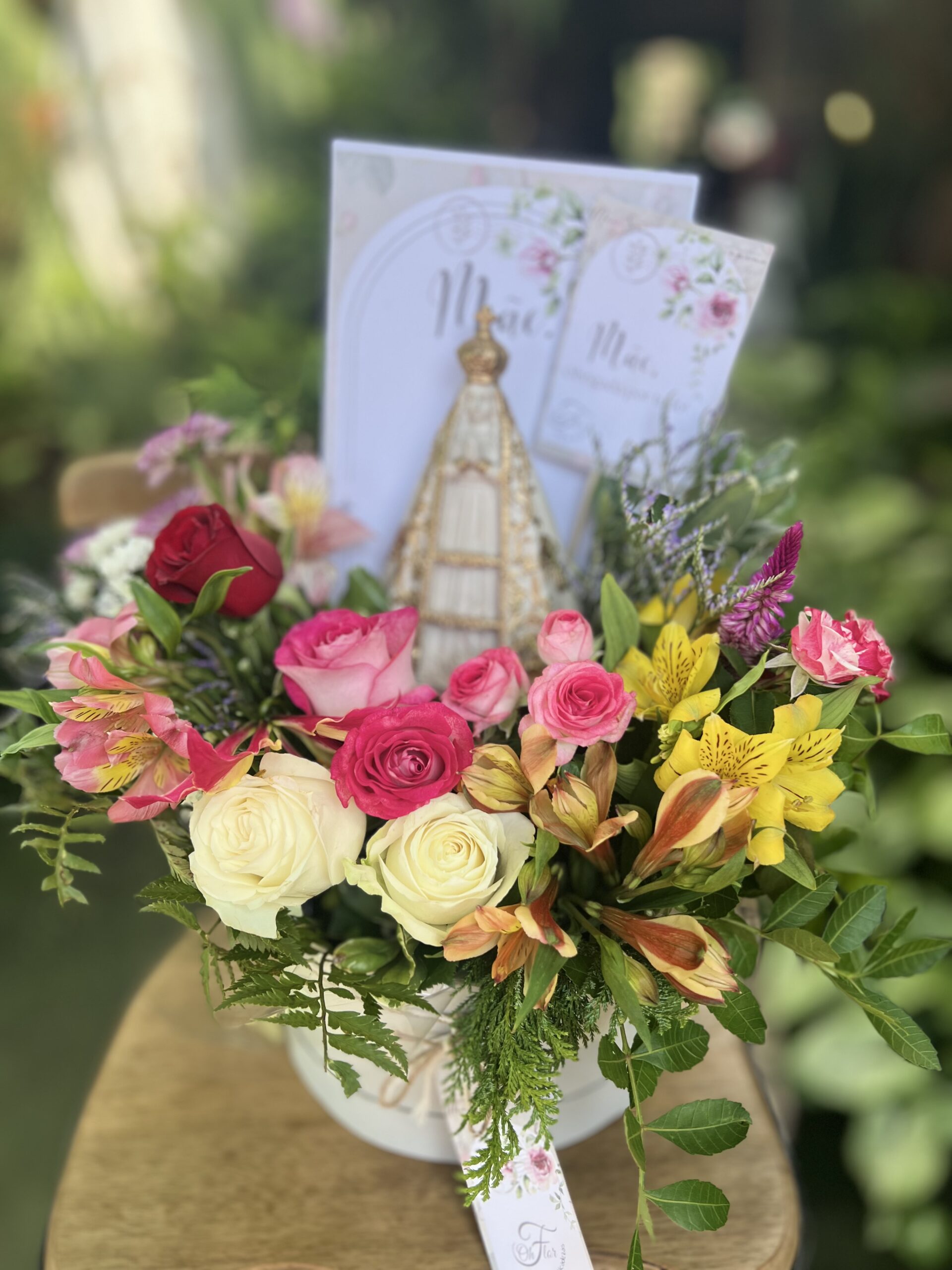 Honre a fé e a tradição com este presente exclusivo: uma caixa em cartonagem contendo um cone de flores frescas da semana, adornado com a imagem da Nossa Senhora Aparecida em pintura envelhecida e detalhes dourados.