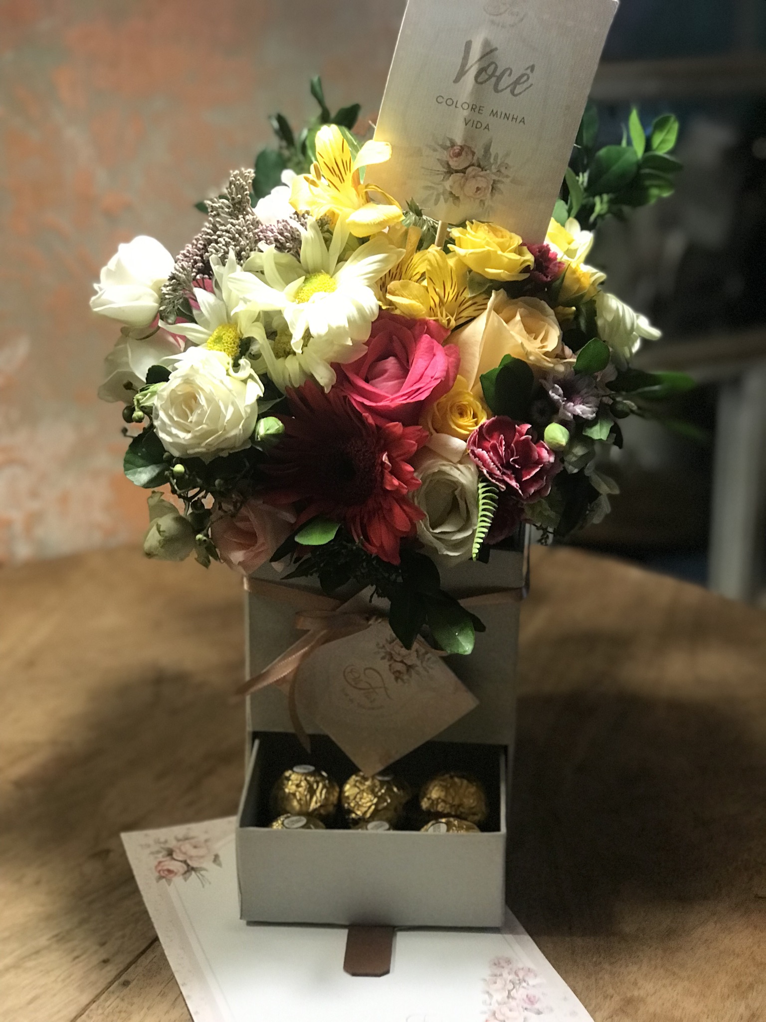 Surpreenda quem você ama com um presente delicioso e irresistível: uma caixa personalizada com oito unidades de bombons Ferrero Rocher, acompanhados de um arranjo de flores frescas e vibrantes, cuidadosamente selecionadas para encantar e emocionar. Tudo isso em uma charmosa caixa em cartonagem com gaveta, que torna o presente ainda mais especial e funcional.