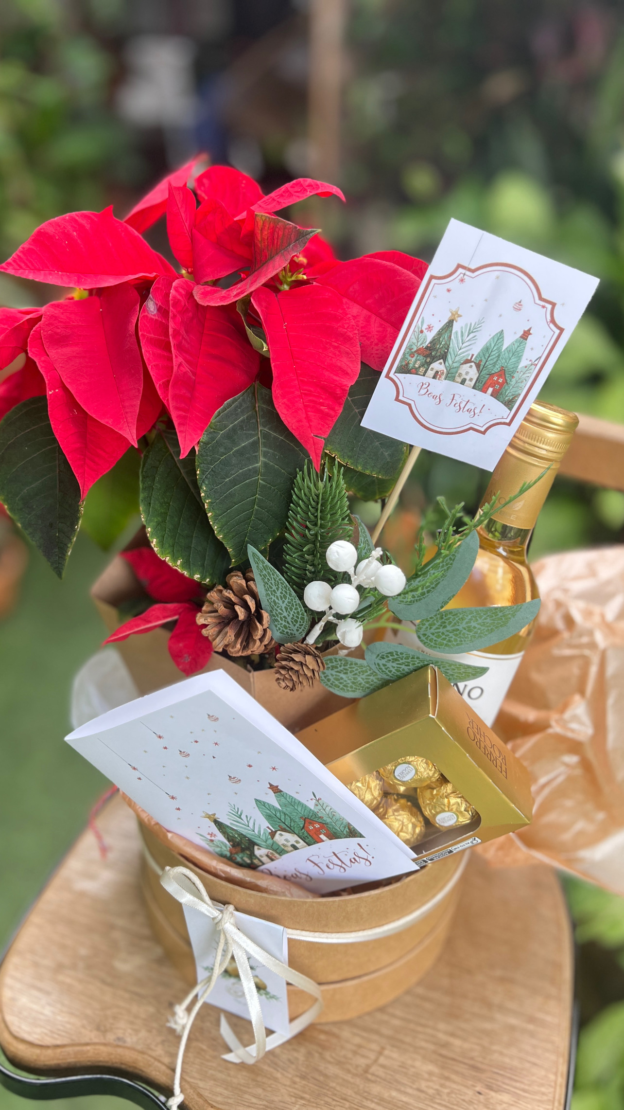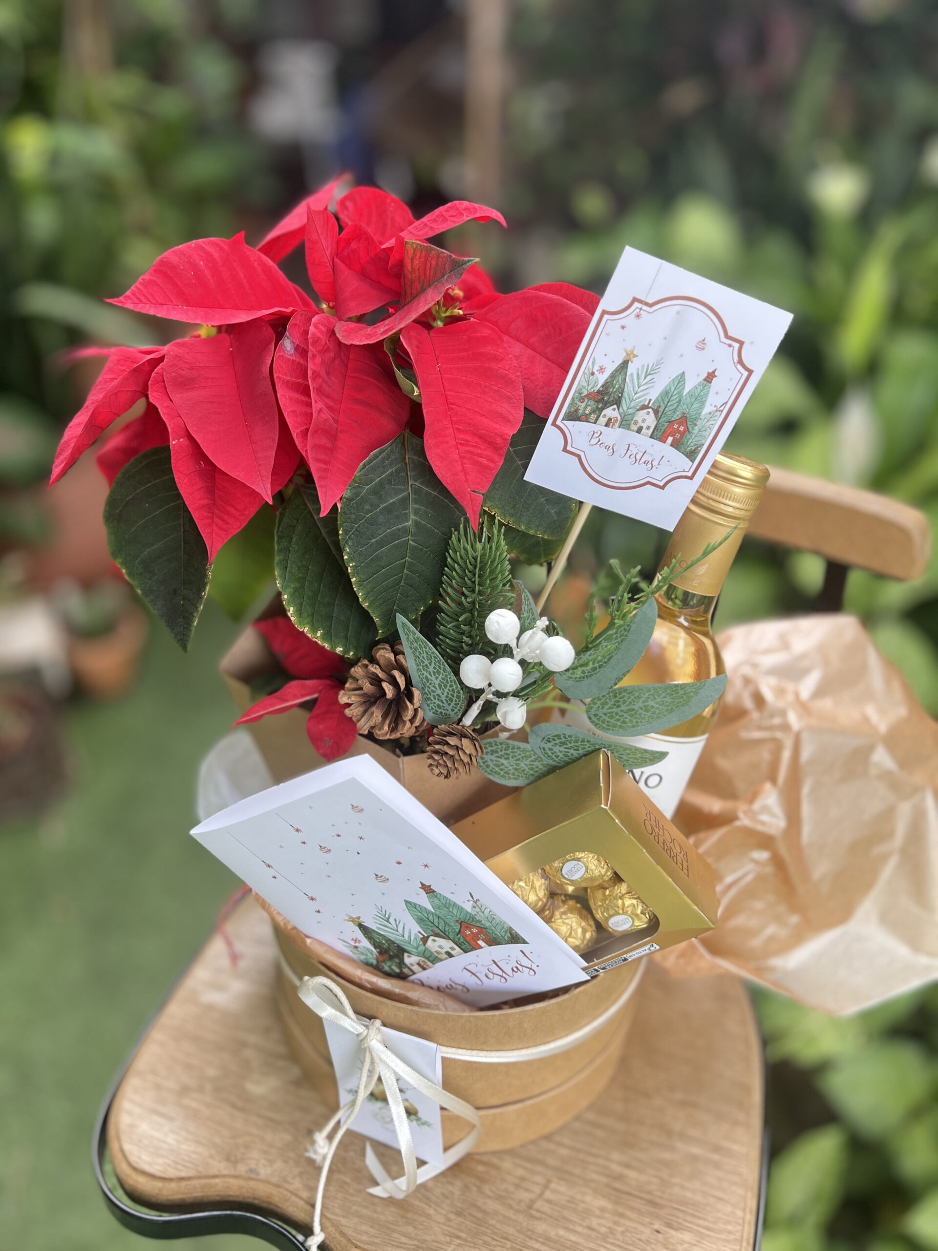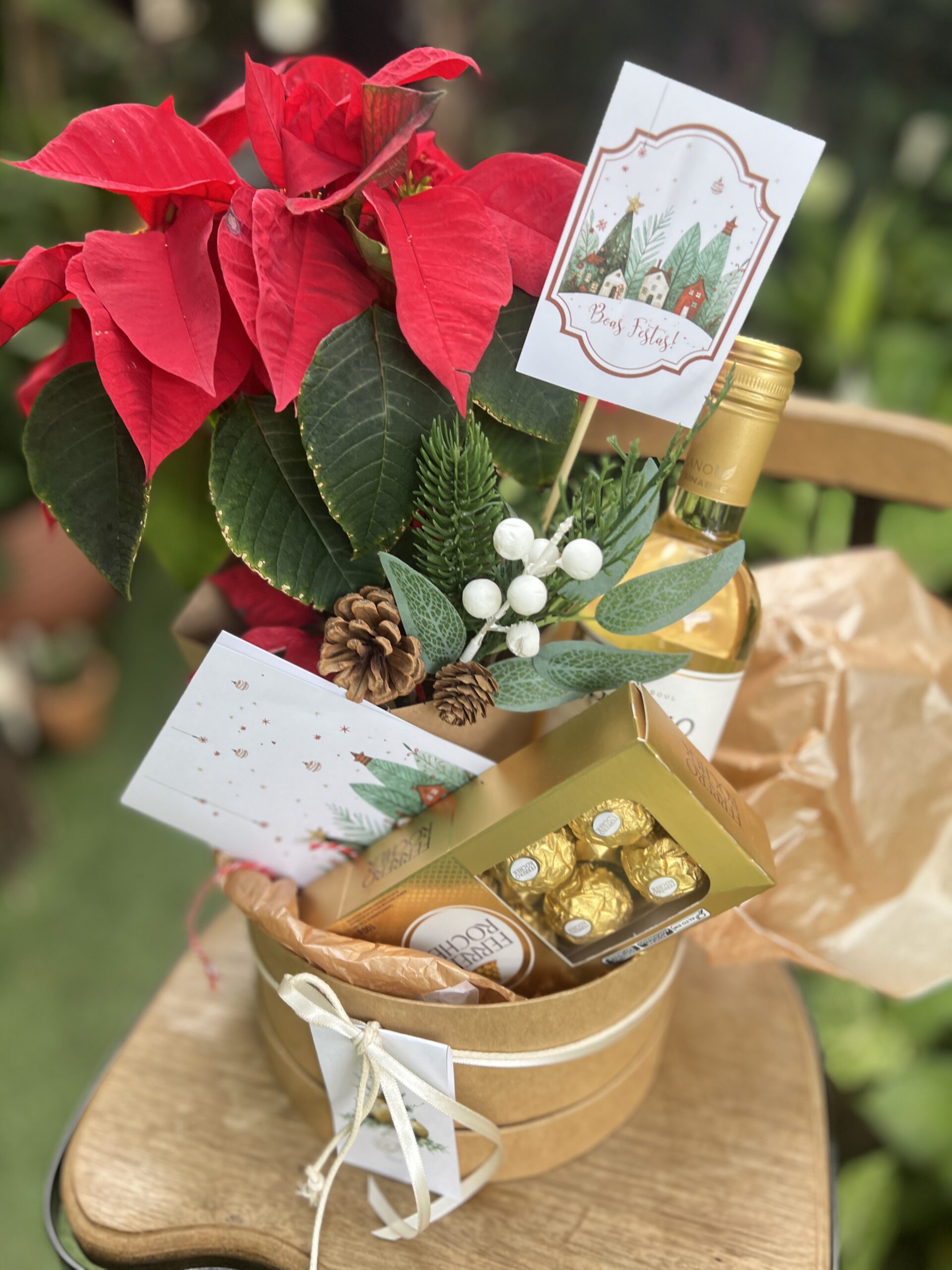 1 Box em cartonagem, 1 vaso de Poinsétia, 1 enfeite de Natal, 1 vinho branco, 1 caixa de Ferrero Rocher com 8 unidades, Rocher, 1 cartão de Natal com sua mensagem até 30 palavras.