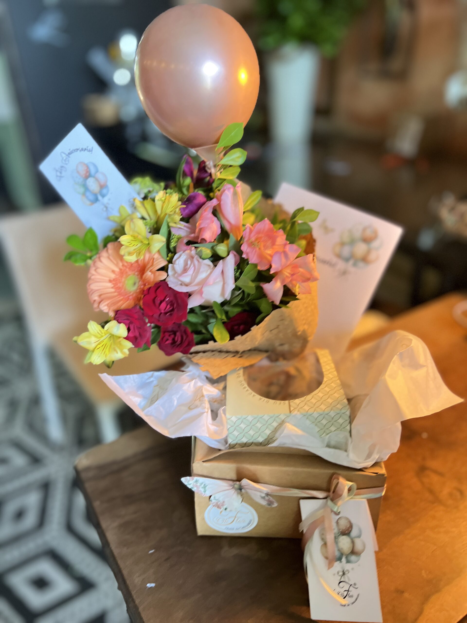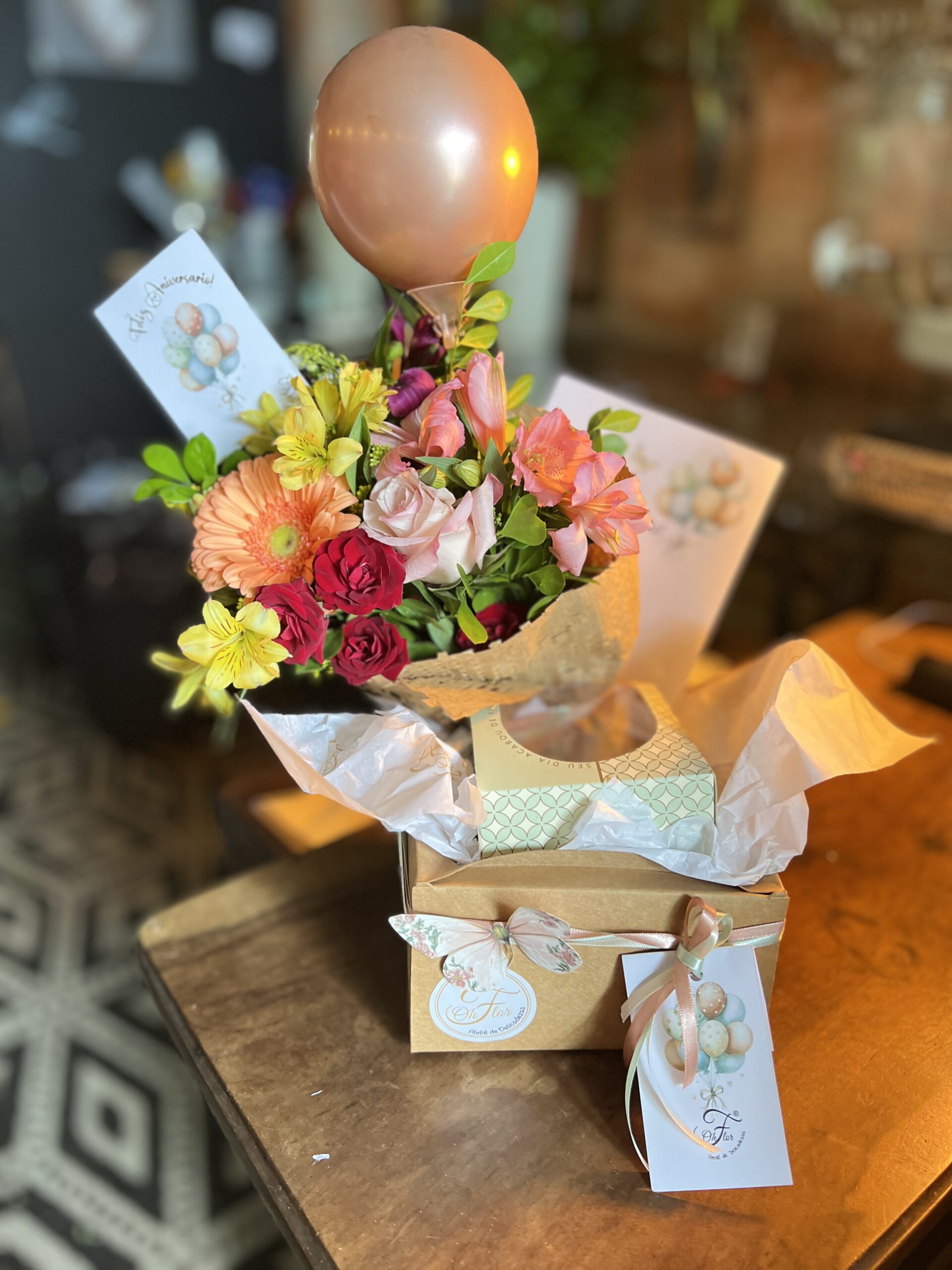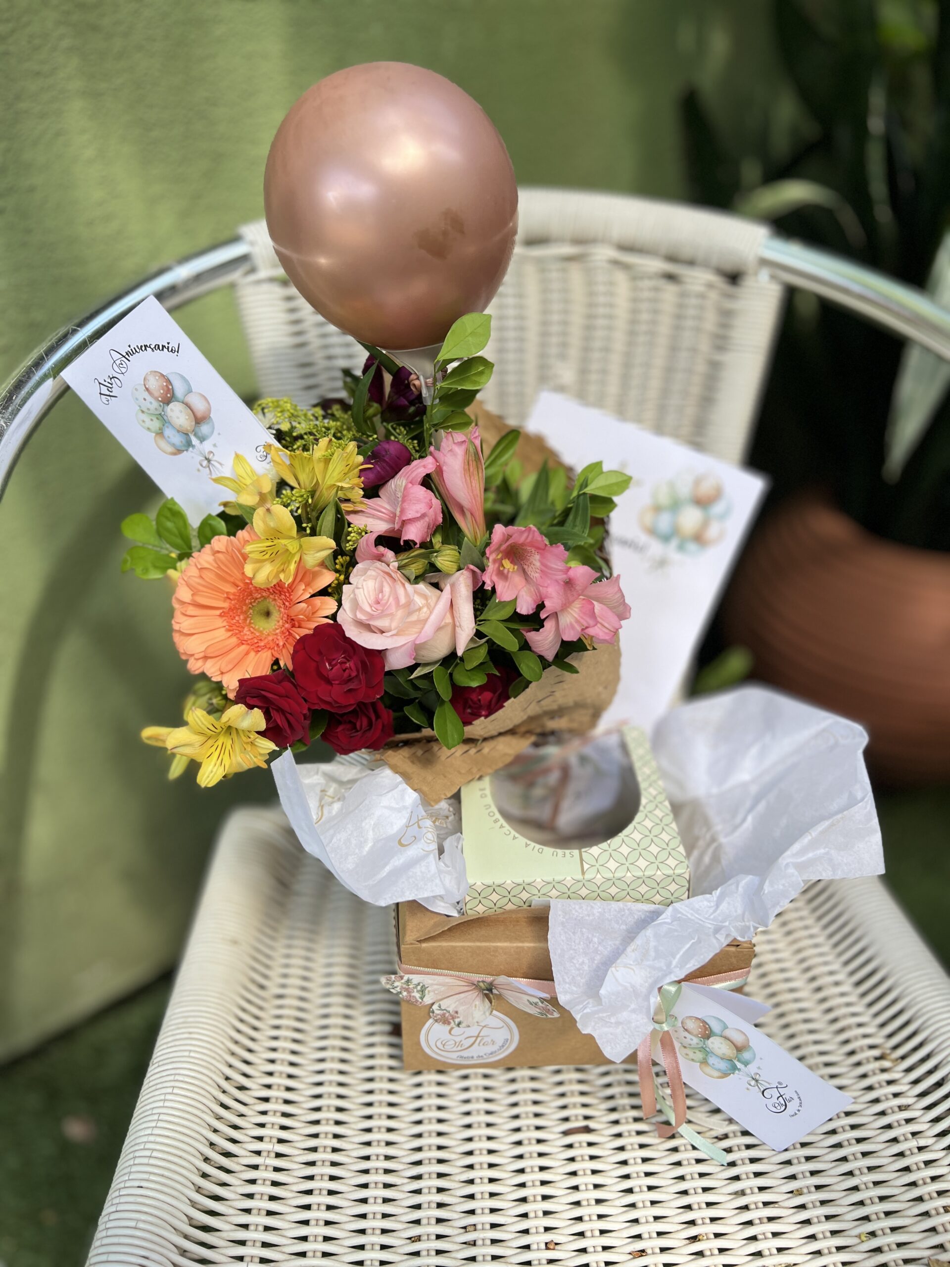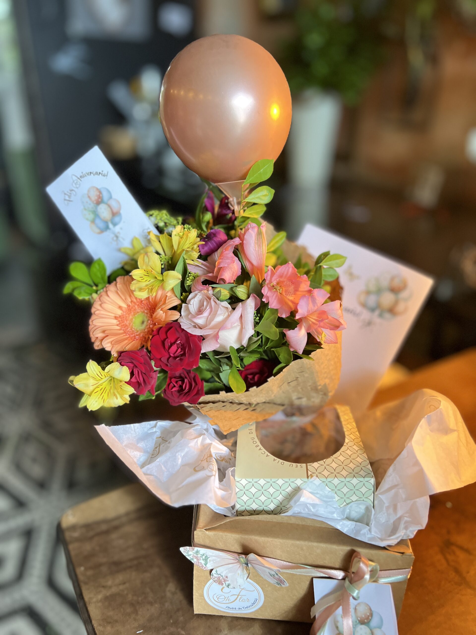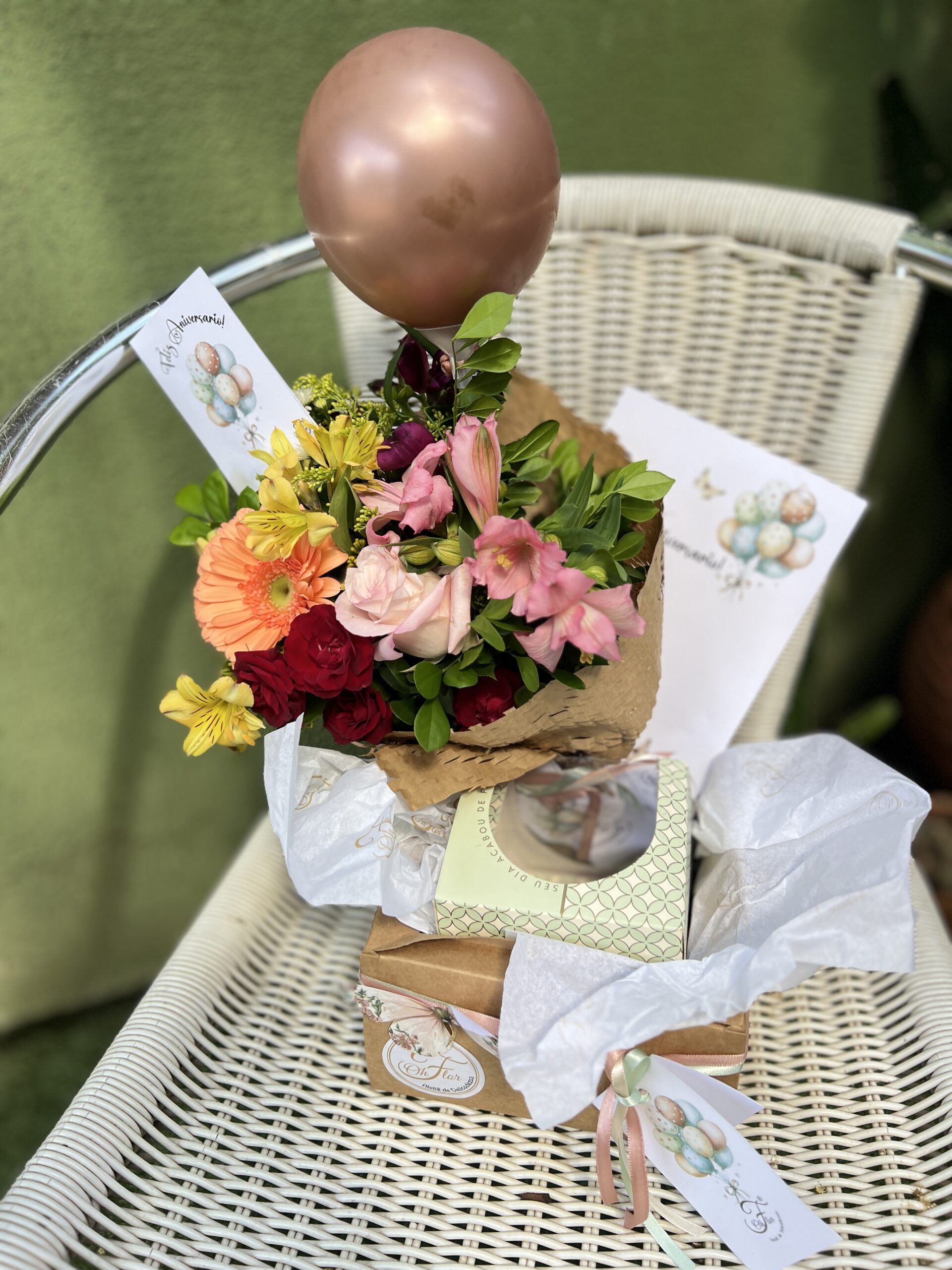 Nossa caixa em kraft vai com Ramalhete PP, 1 mini torta Silvia Ribeiro, 1 balão, carta e plaquinha. Foi pensada para surpreender e encantar, com uma seleção premium de itens que celebram a elegância e o bom gosto. Dentro dela, ele encontrará: