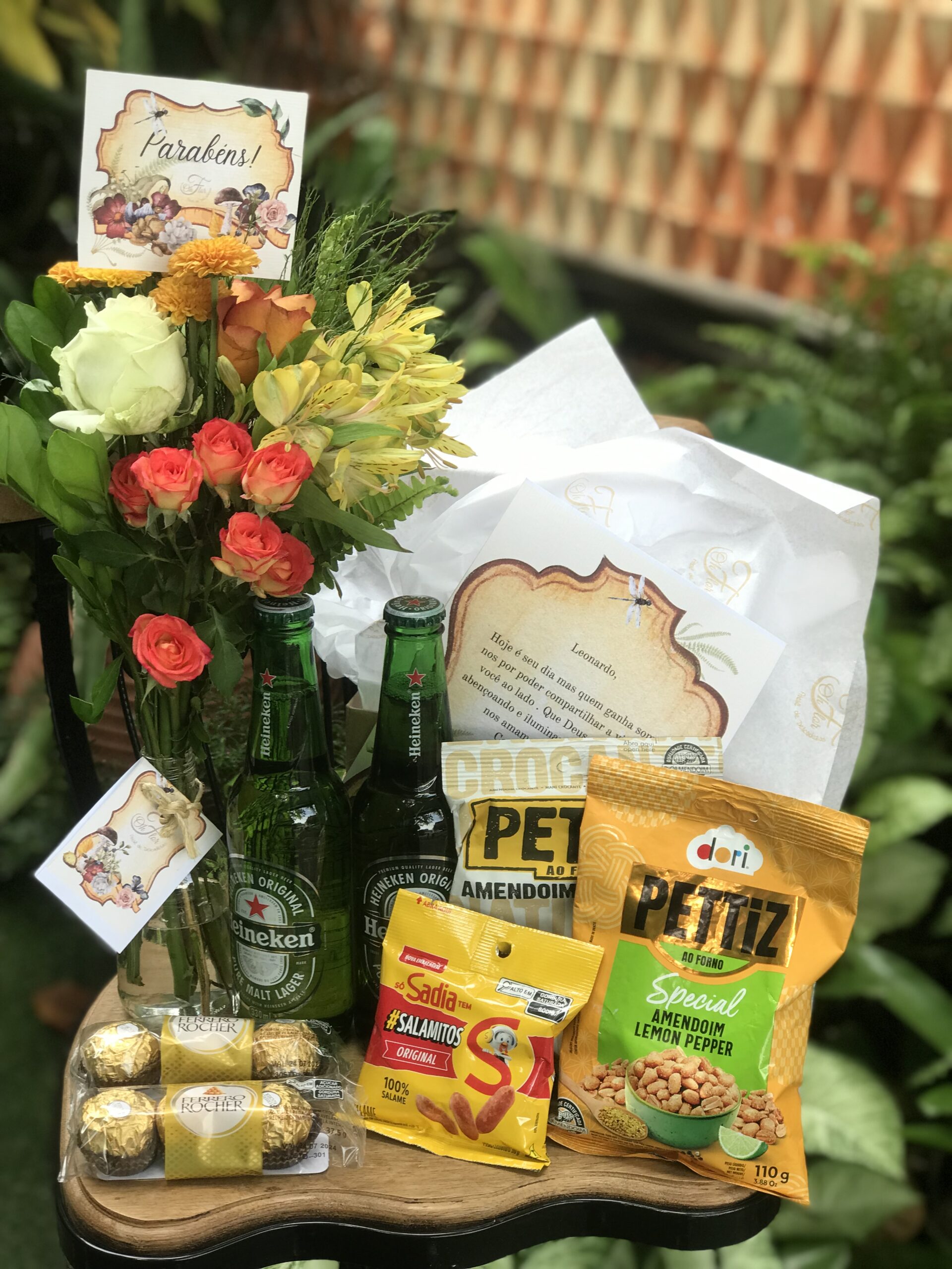 Combinação perfeita: A união de flores frescas, cervejas geladas, amendoim crocante, Ferrero Rocher e salame, um presente que agrada a todos os gostos e ocasiões.