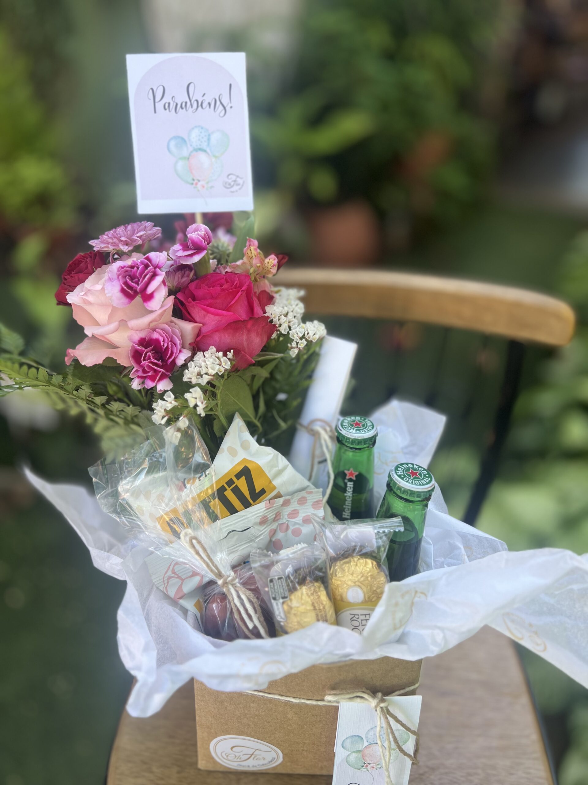 - Aniversário: Comemore a data especial com uma cesta alegre e vibrante, com flores coloridas, cervejas geladas e amendoim crocante para um dia cheio de alegria.