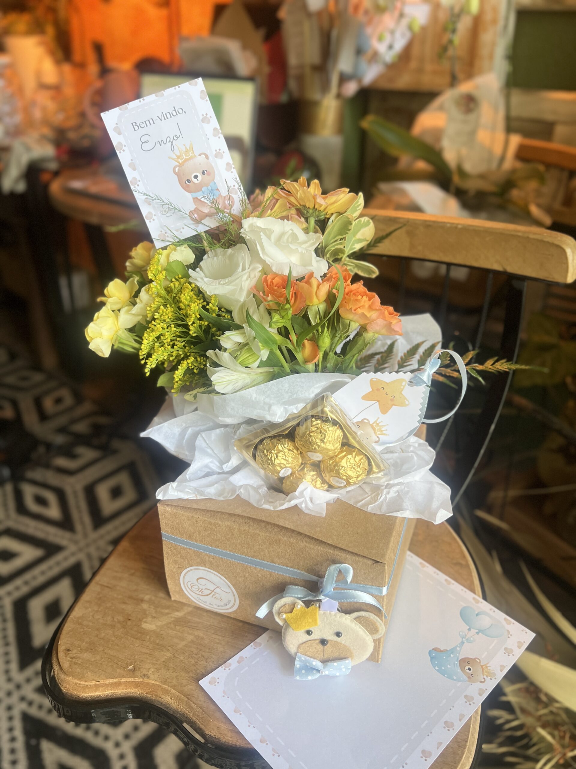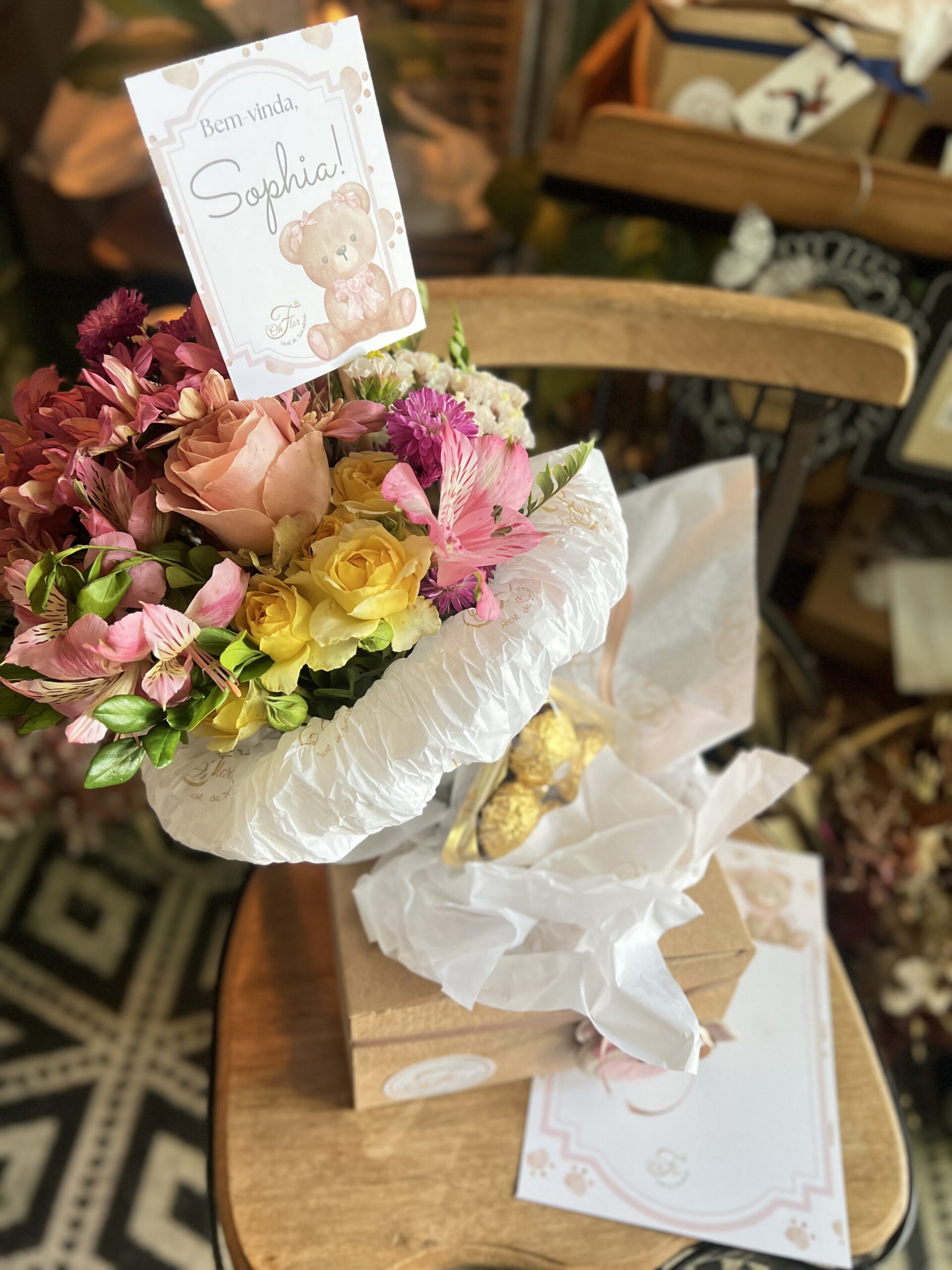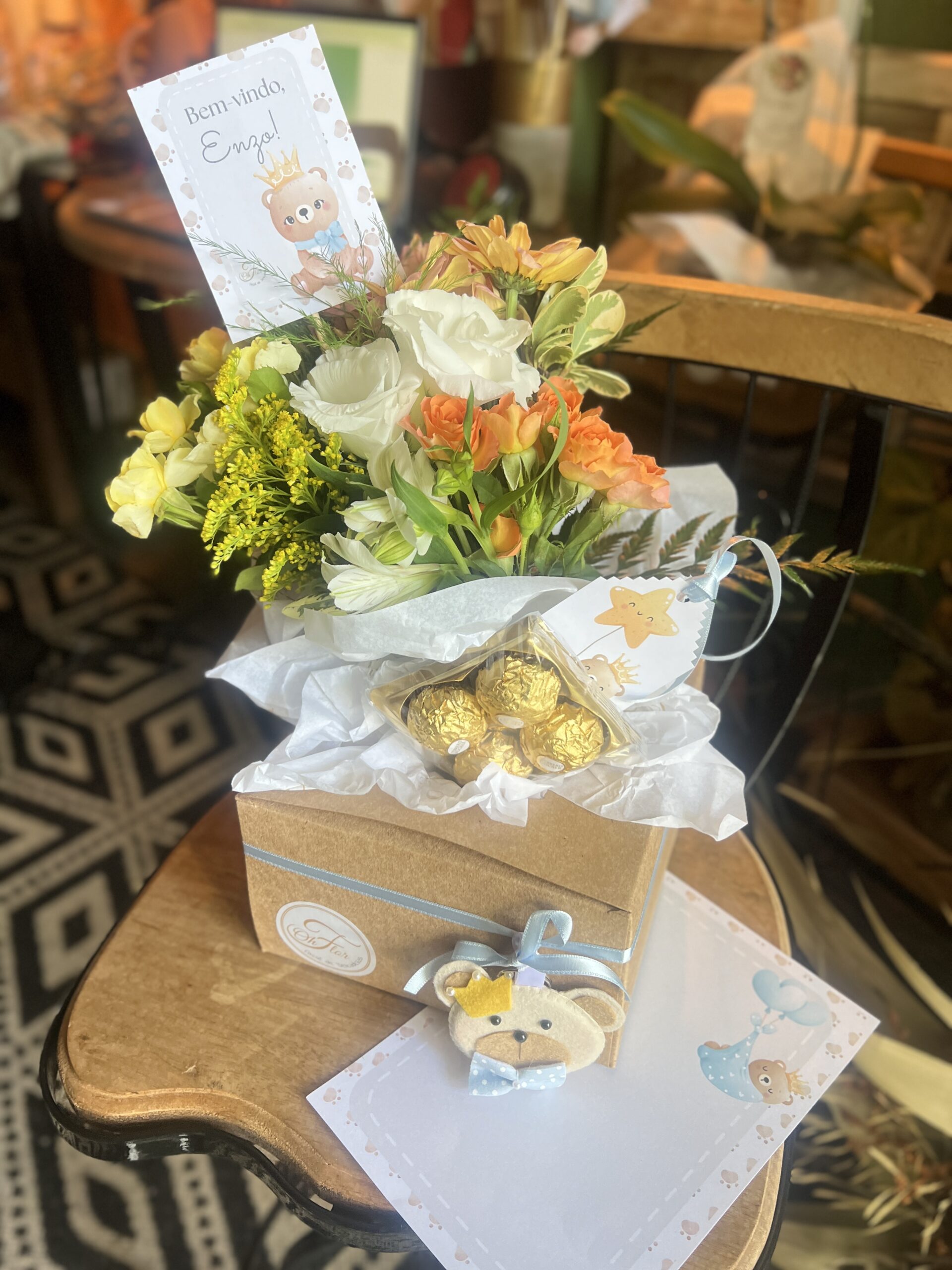 Um presente único e personalizado: Cada caixa vai com um mix de flores frescas da semana, escolhidas com carinho para transmitir a sua mensagem especial e bombons Ferrero Rocher.