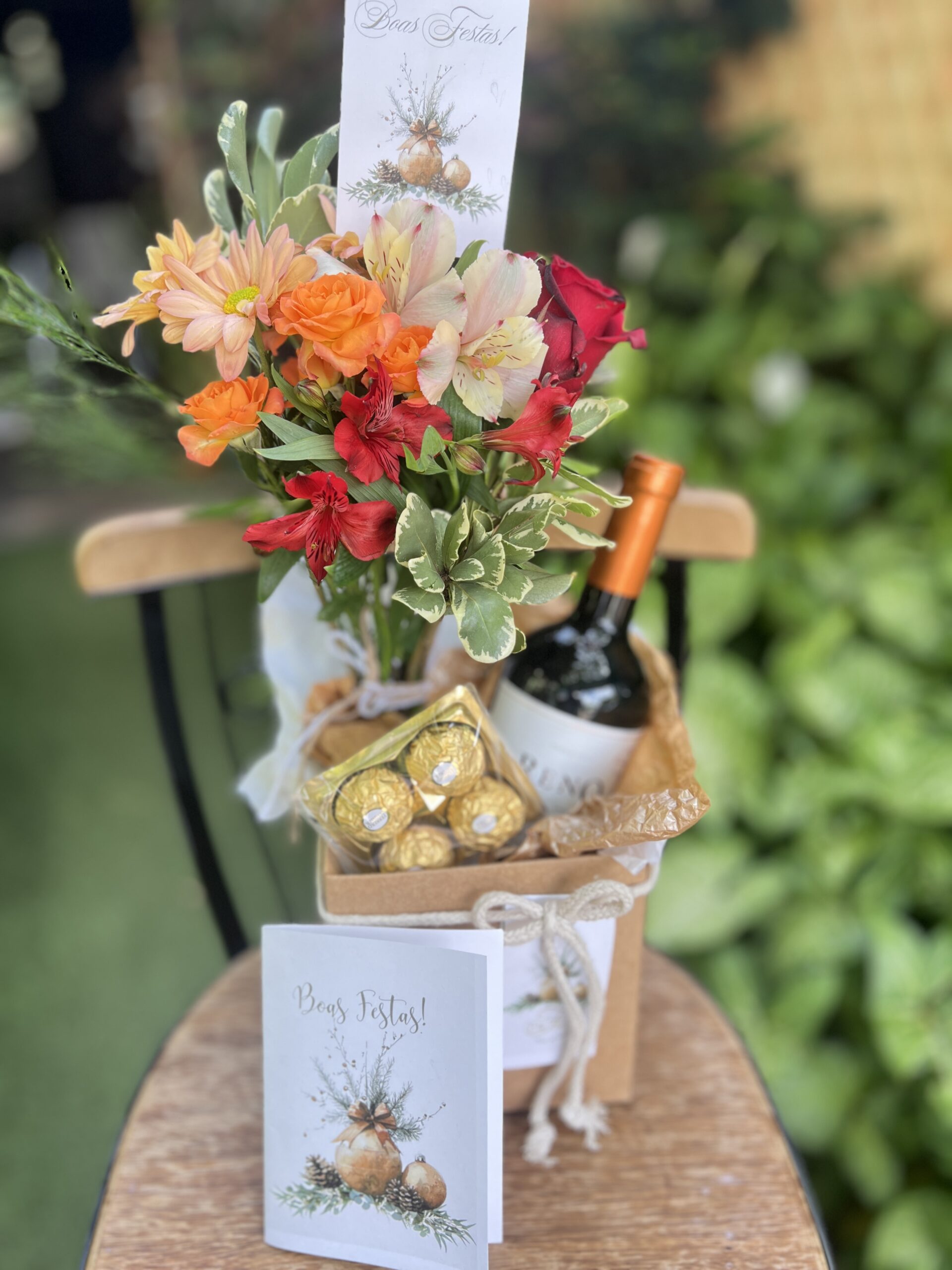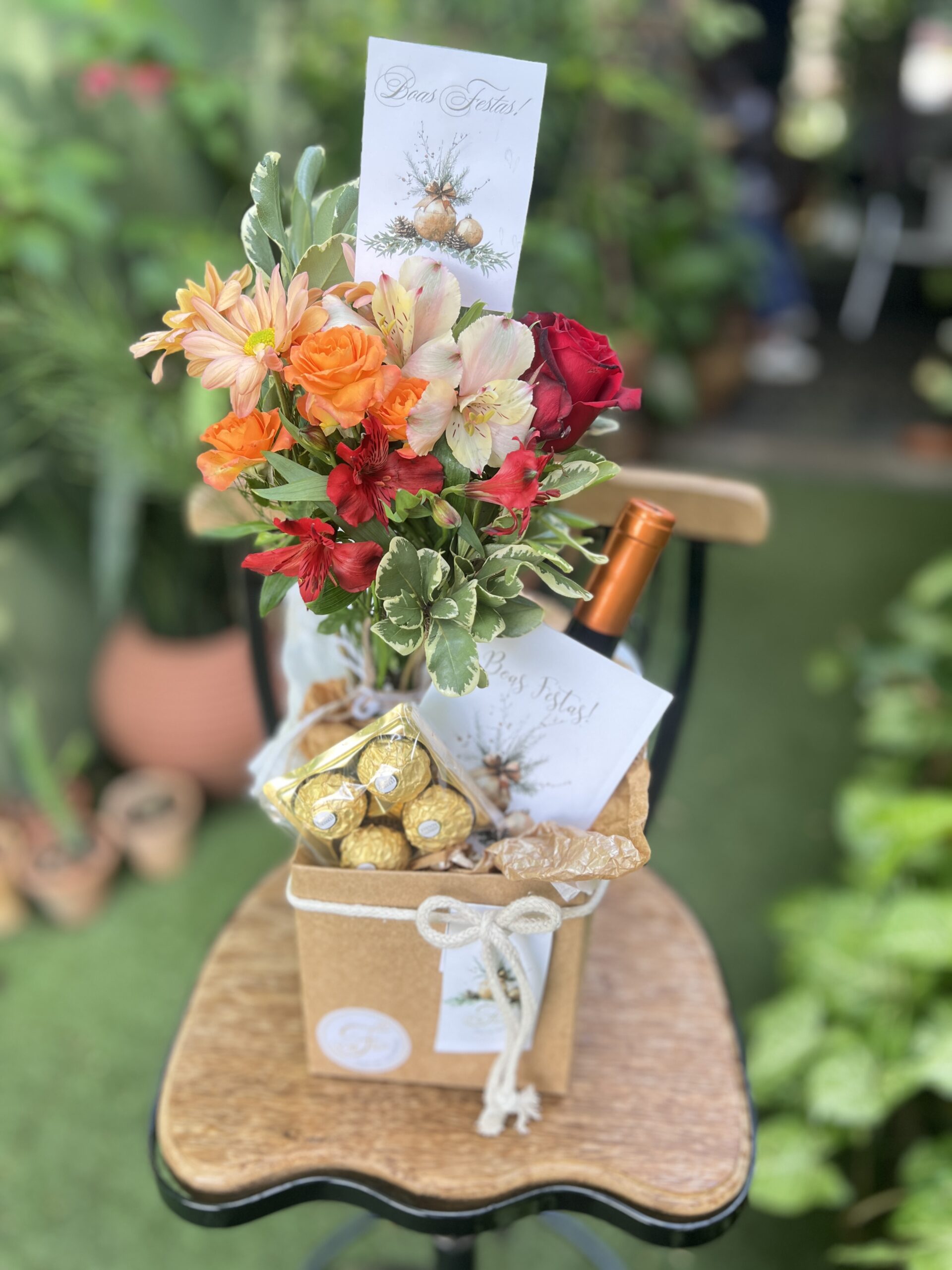 1 Caixa em papel kraft, 1 arranjo de flores frescas da semana, 1 vinho tinto, 1 caixa de chocolate Ferrero Rocher com 4 unidades, 1 carta de Natal com sua mensagem até 100 palavras.