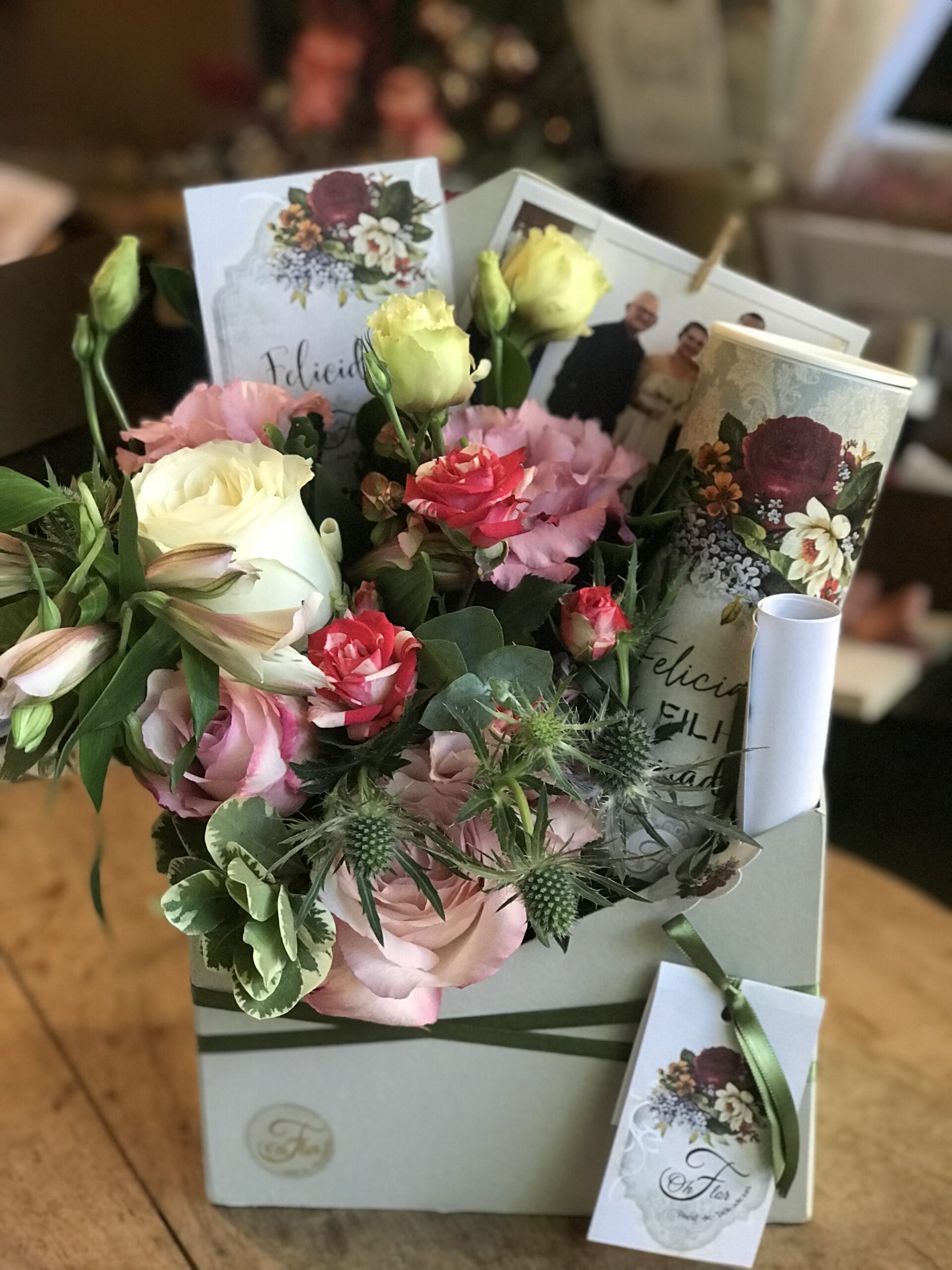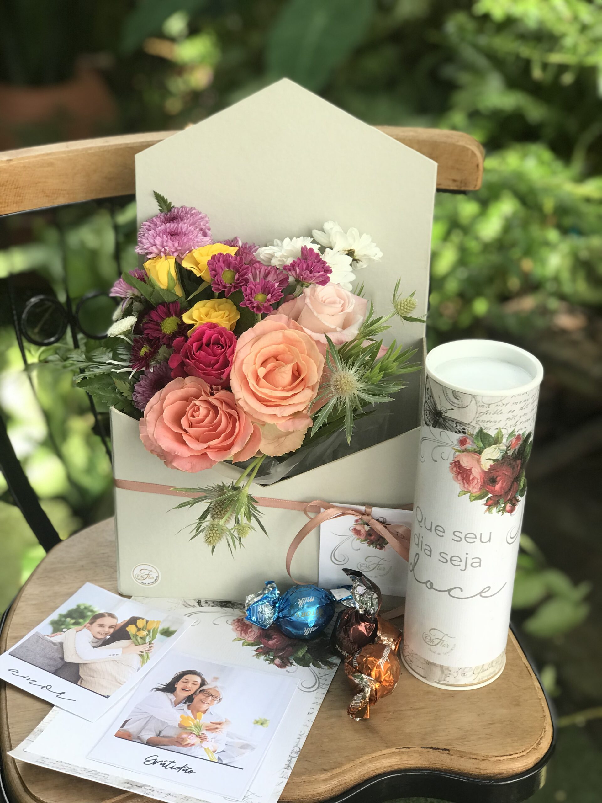 - Buquê de flores frescas: O buquê é composto por flores da estação, como rosas, alstroemerias, crisântemos, mini rosa, tango, limonio. As flores são cuidadosamente selecionadas e arranjadas para criar uma composição única e bonita.