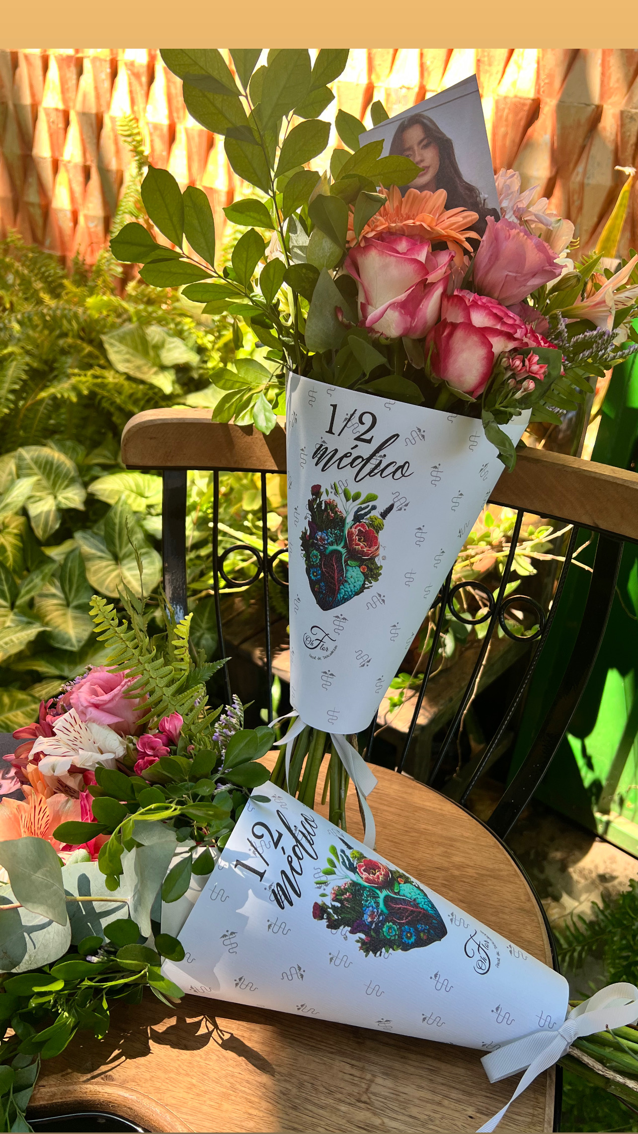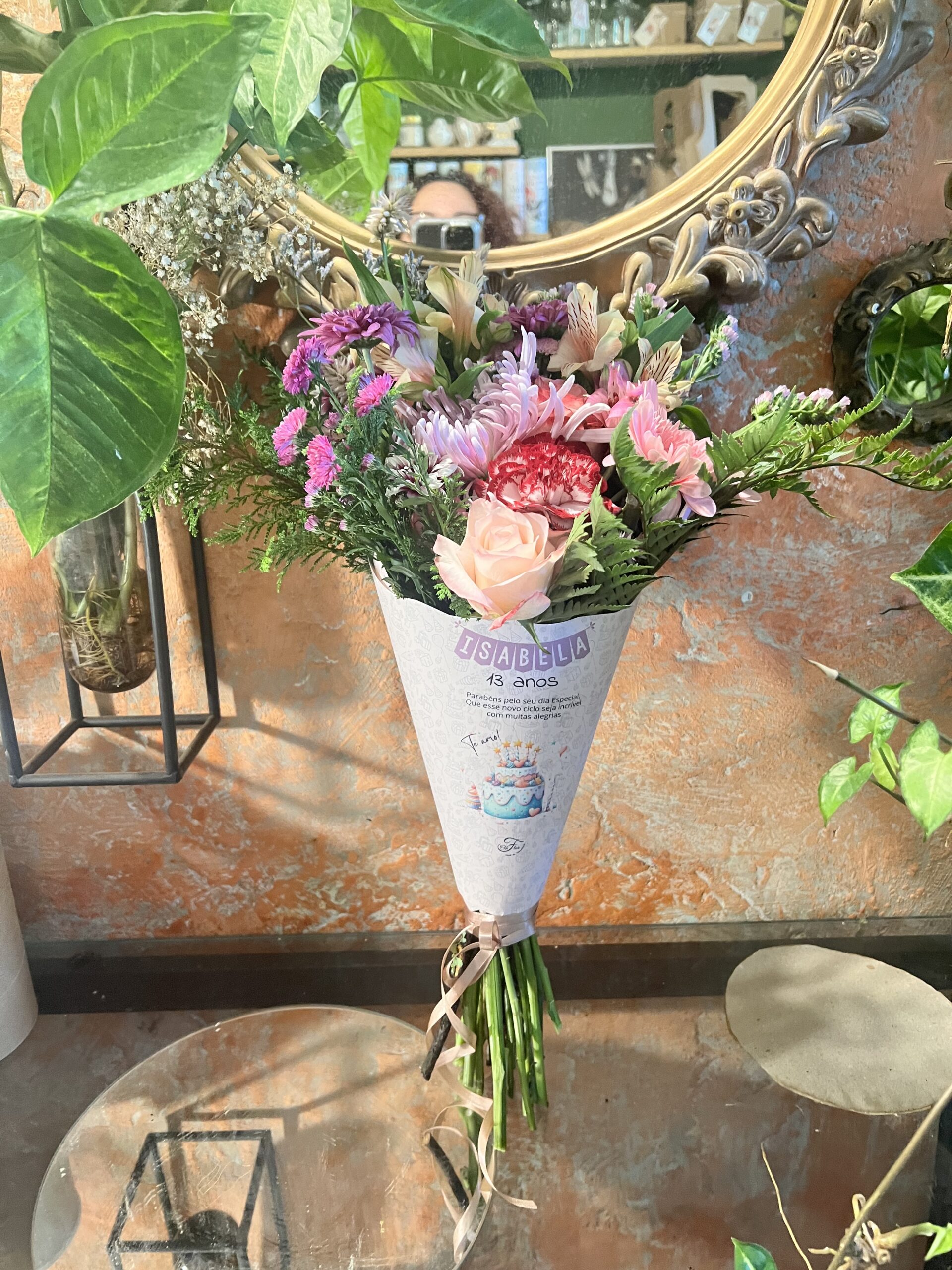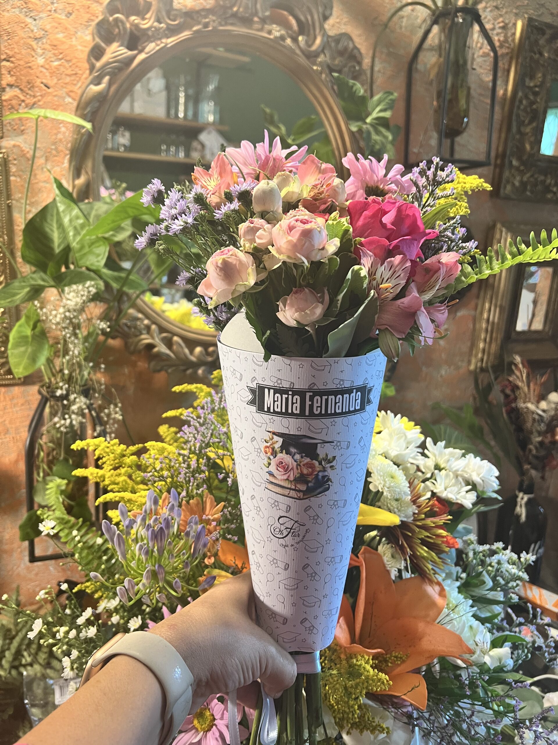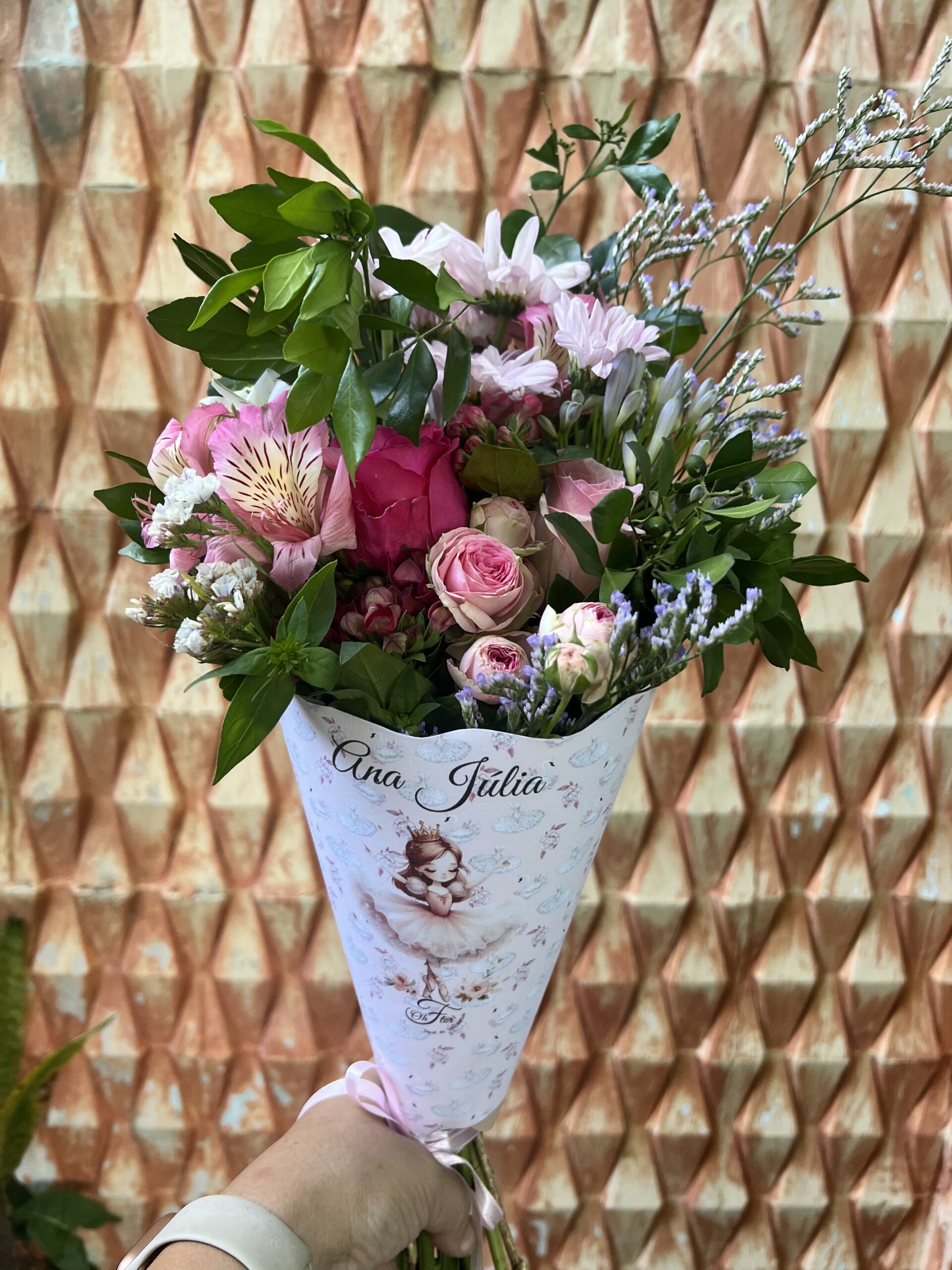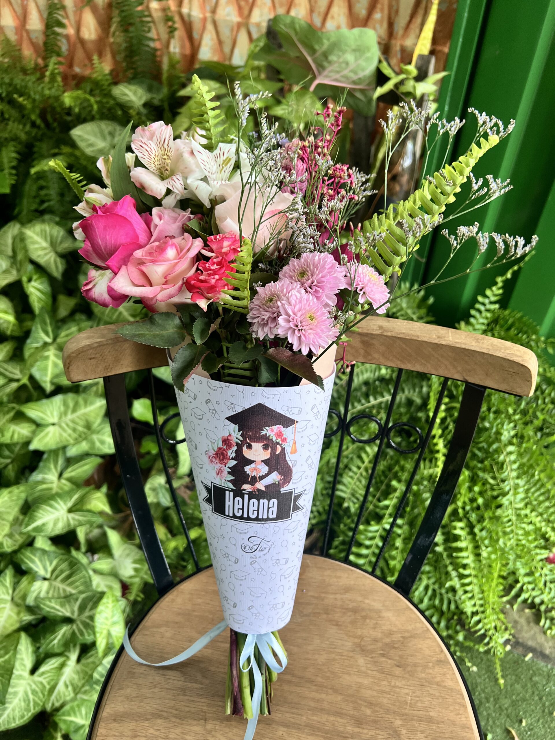Este é um cone personalizável, com ilustração e mensagem (pode ser uma fito). Flores frescas da semana é muita beleza e personalidade.