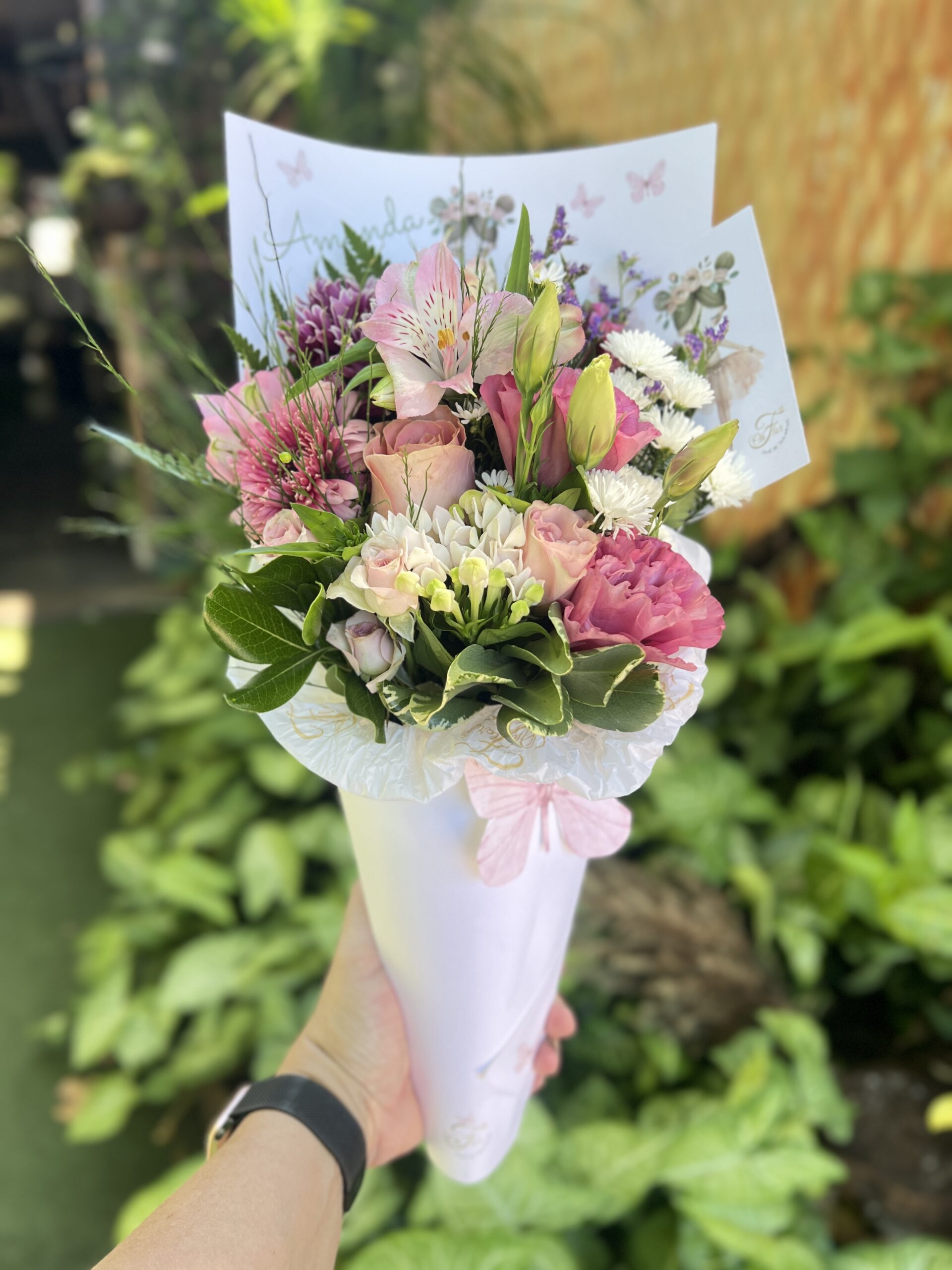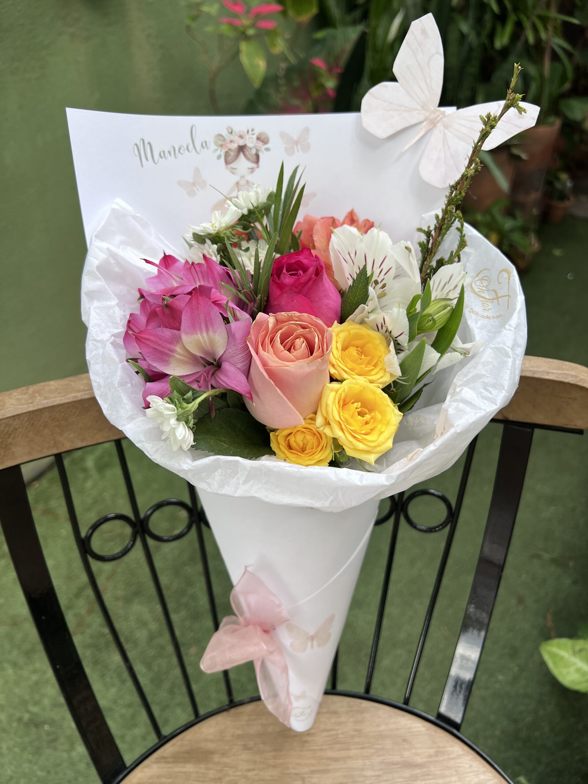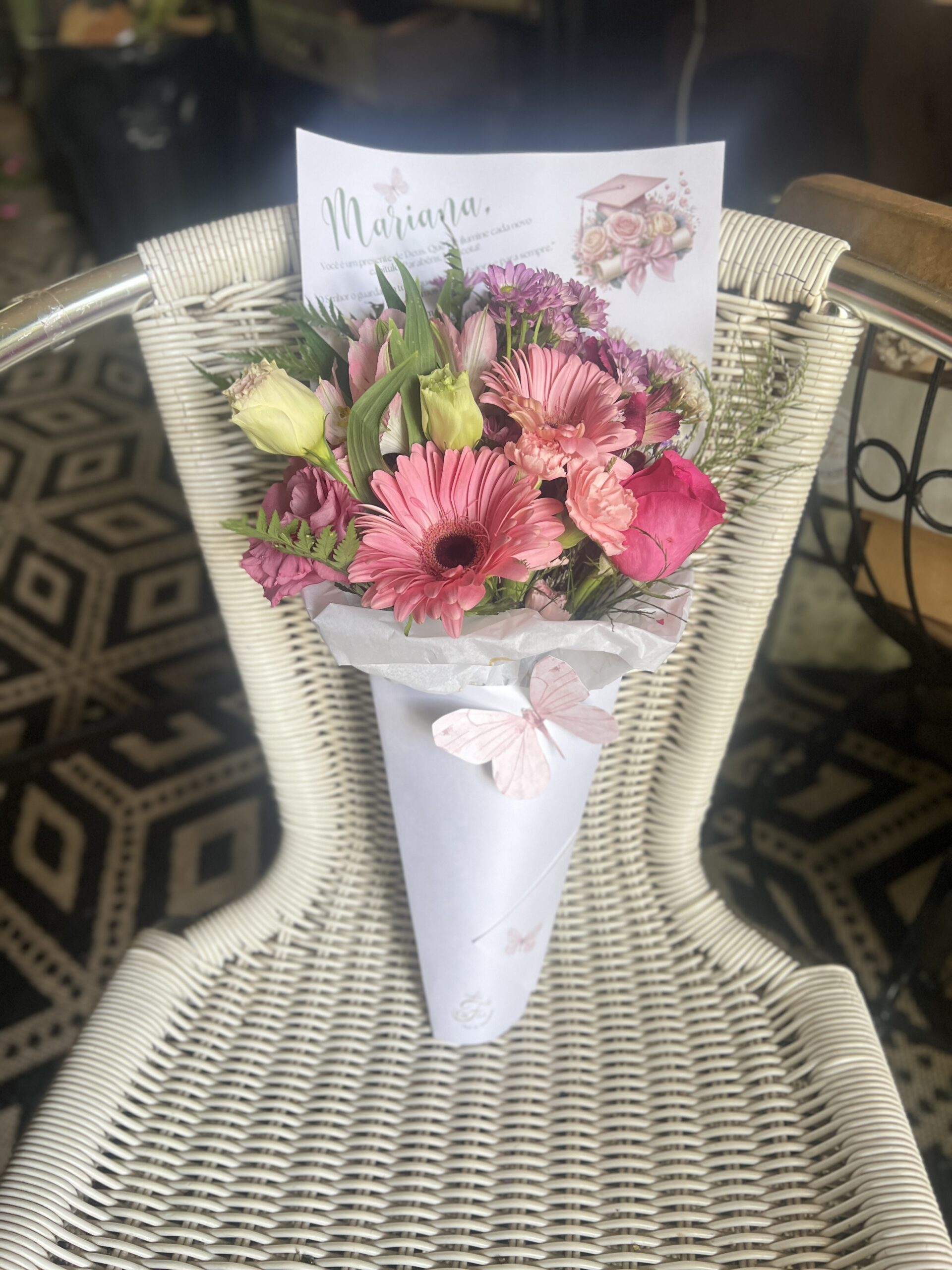 Um presente único e personalizado: Cada cone é feito à mão com um mix de flores frescas da semana, escolhidas com carinho para transmitir a sua mensagem especial.