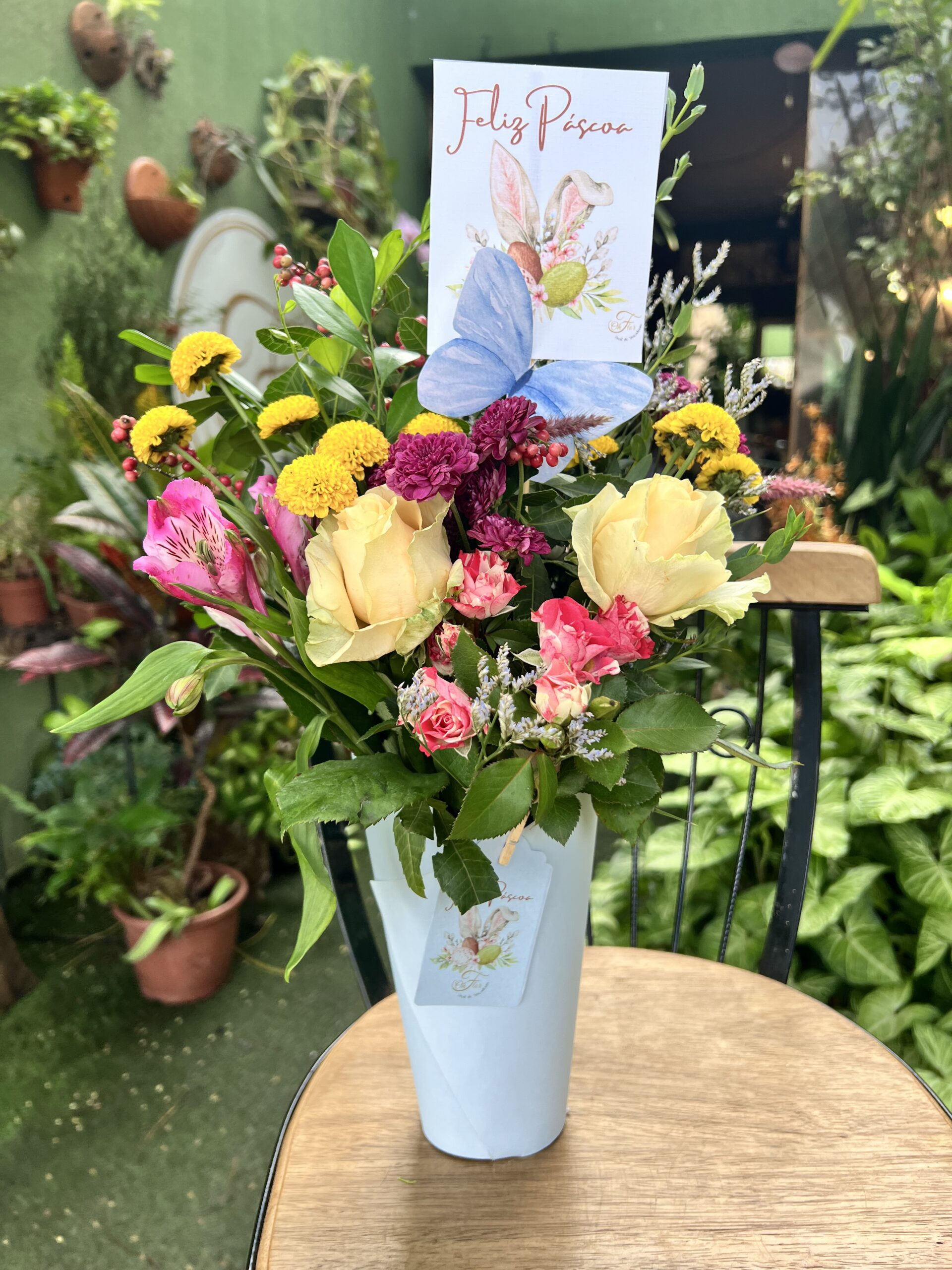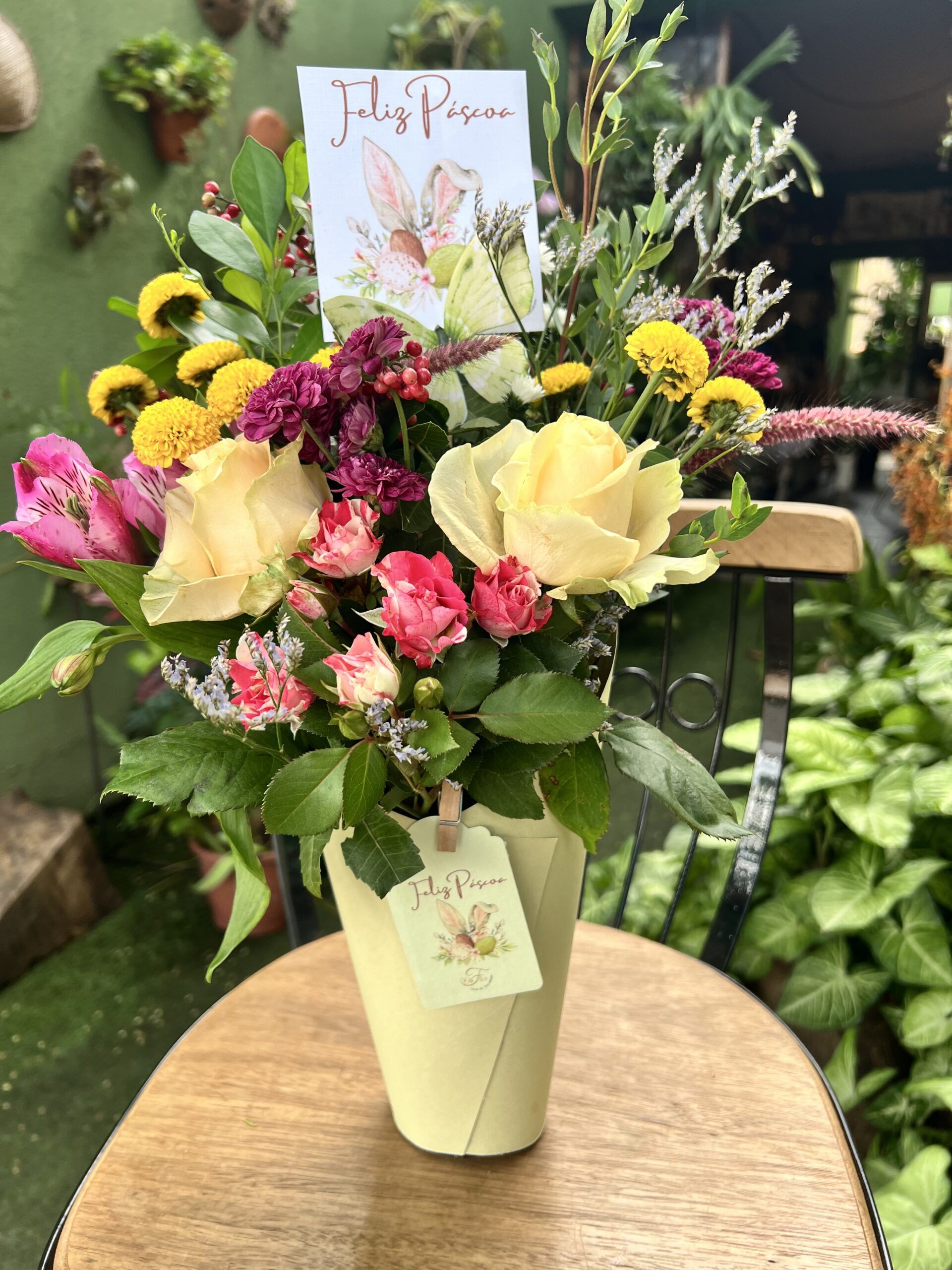 Cada cone é cuidadosamente montado, com flores selecionadas que combinam perfeitamente com as cores vibrantes do papel. O resultado é um presente original e cheio de personalidade, ideal para presentear em aniversários, datas comemorativas, ou para alegrar o dia de alguém especial.