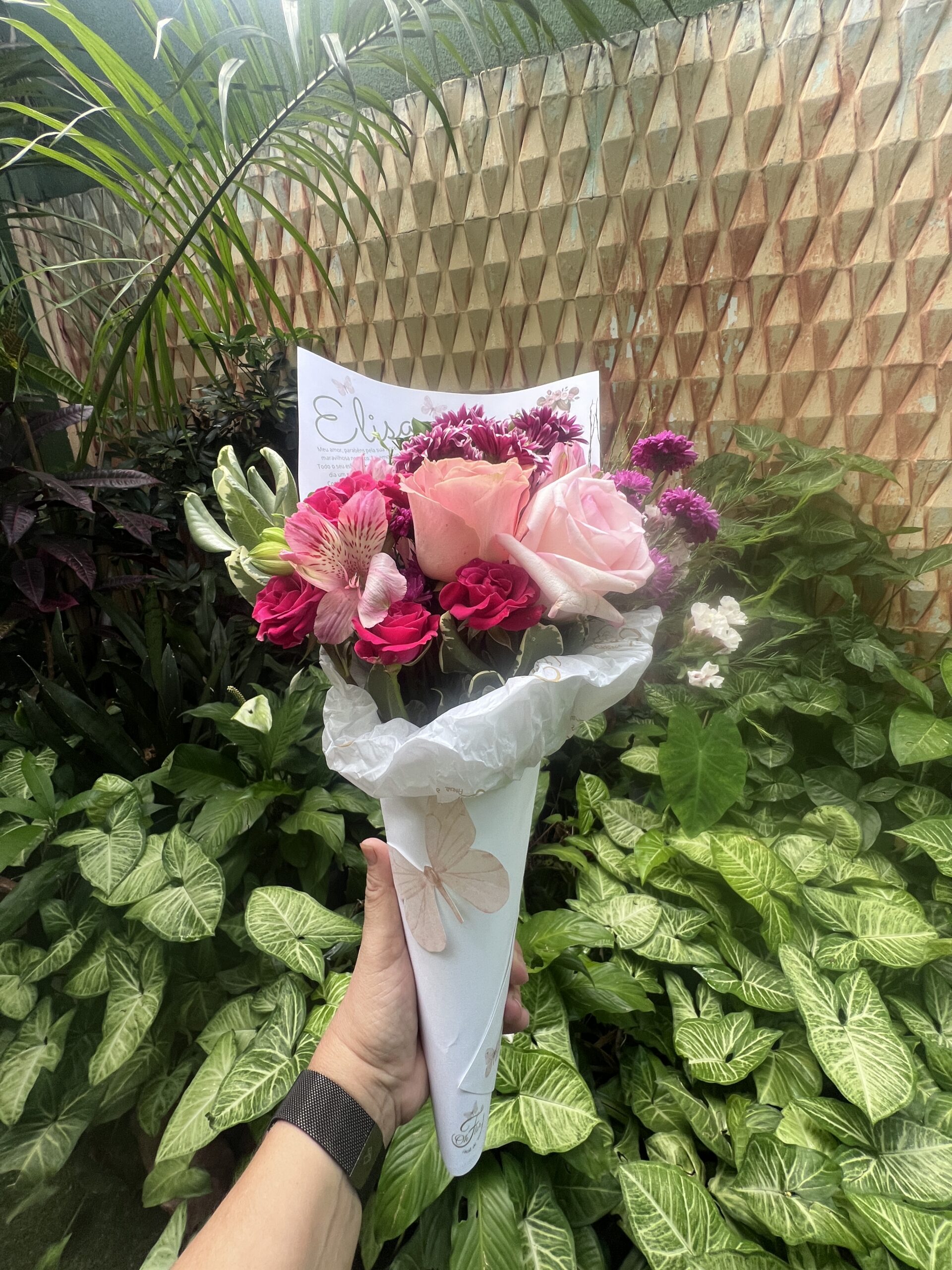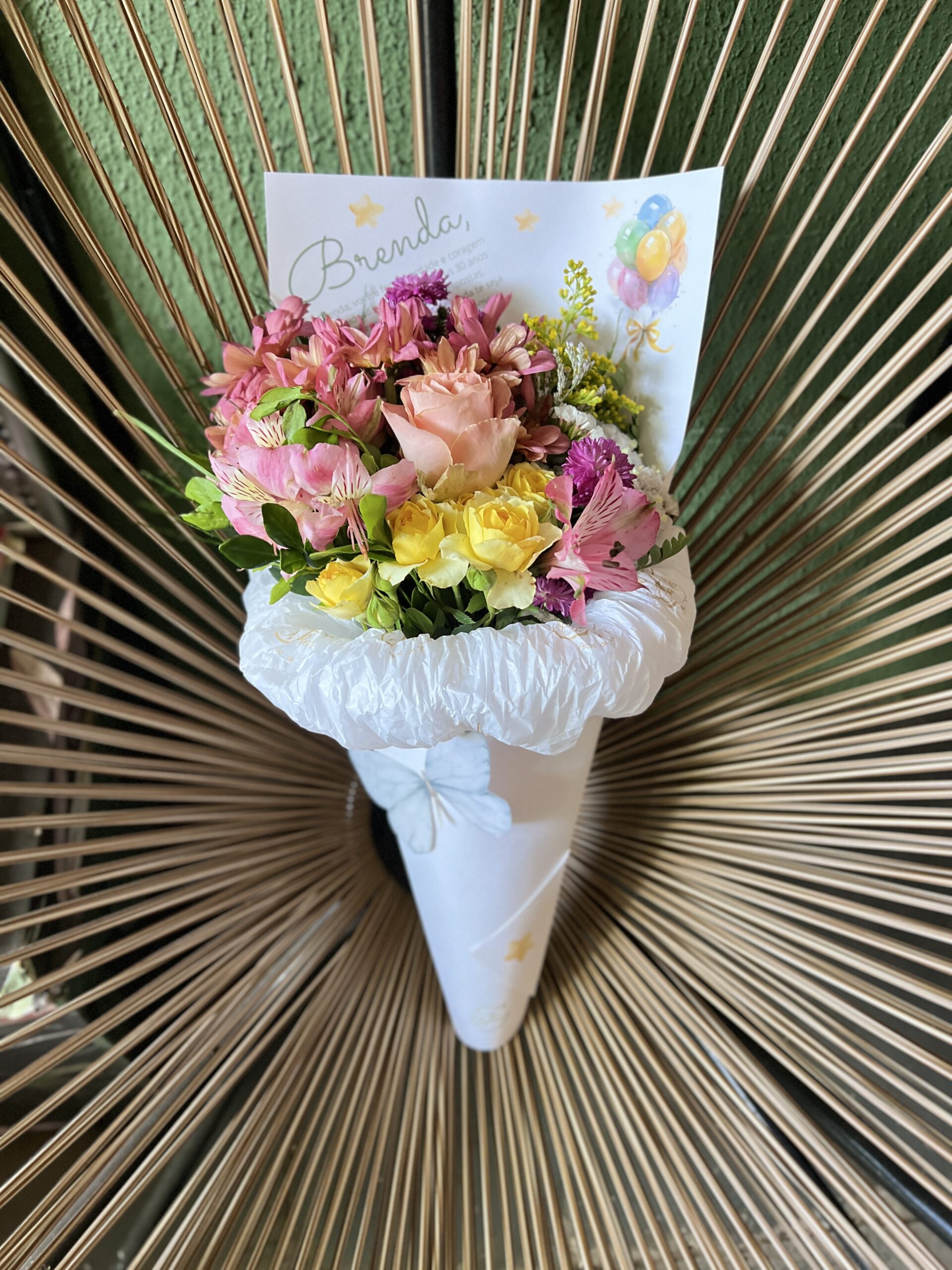 Um presente único e personalizado: Cada cone é feito à mão com um mix de flores frescas da semana, escolhidas com carinho para transmitir a sua mensagem especial.