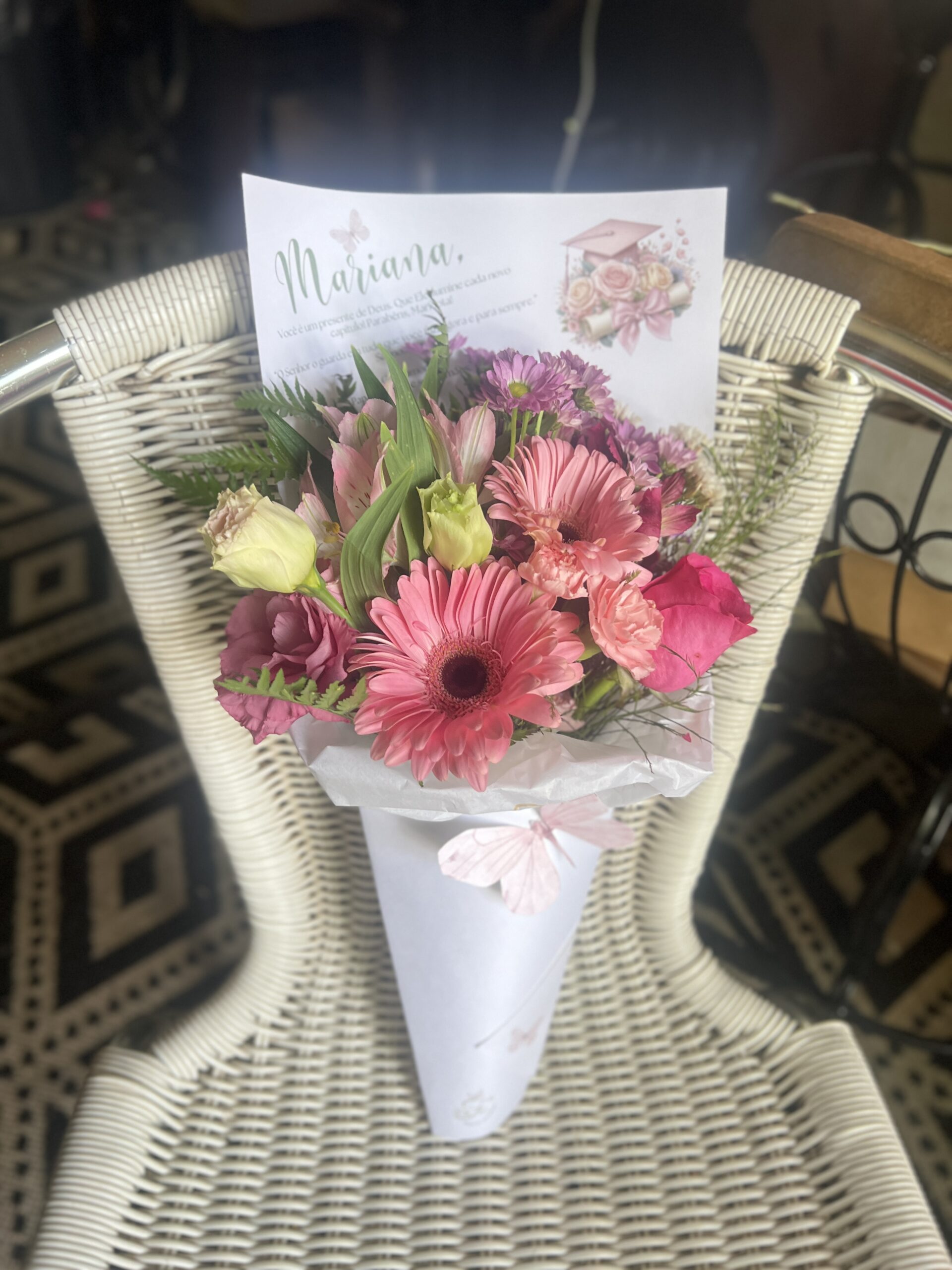 Encante com um presente exclusivo que combina a beleza das flores frescas com a delicadeza do cone personalizado.