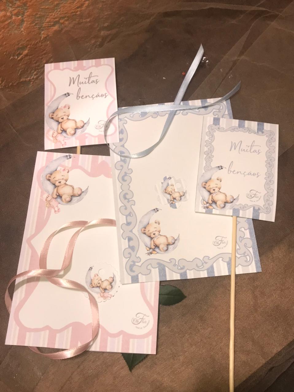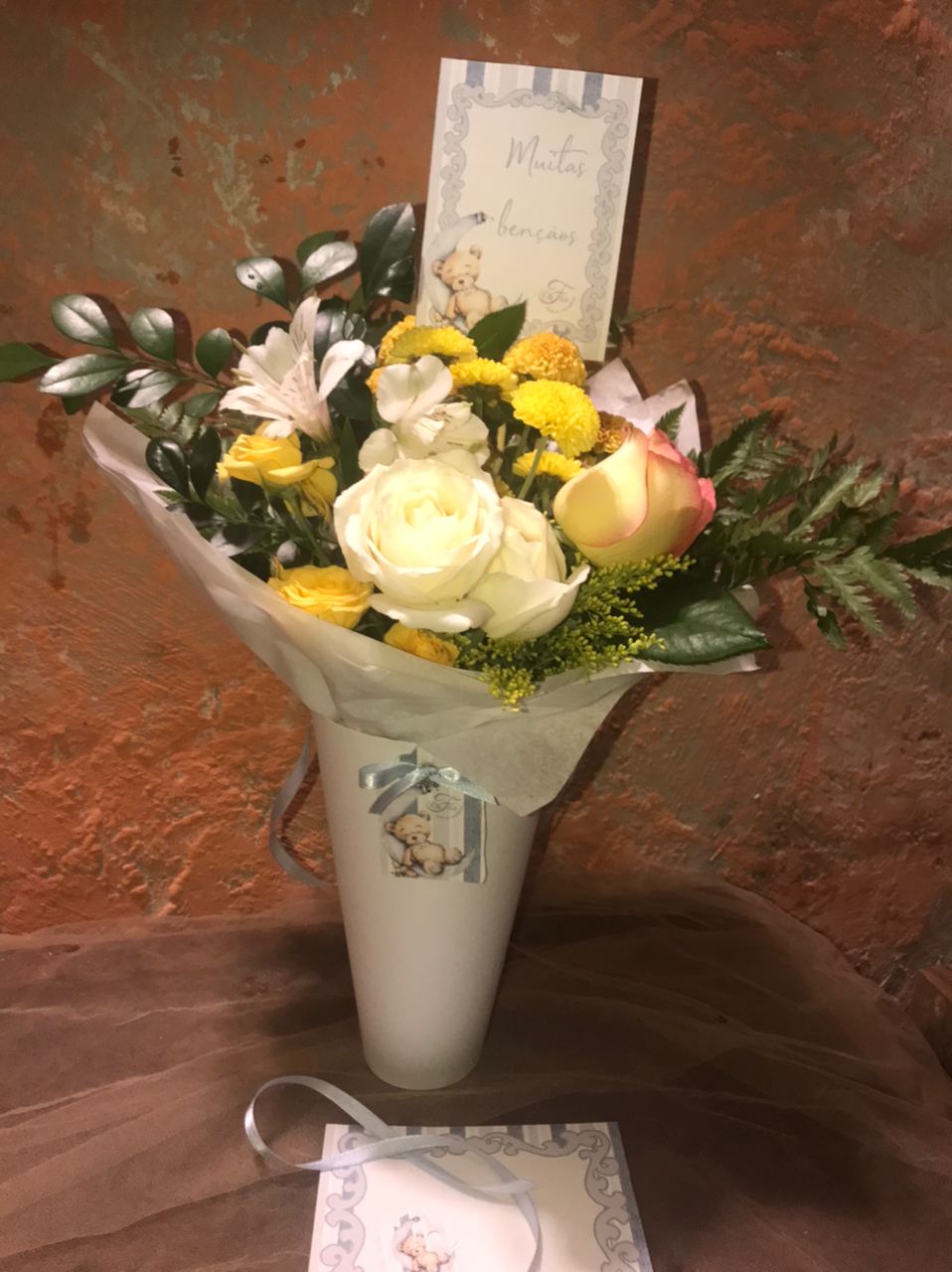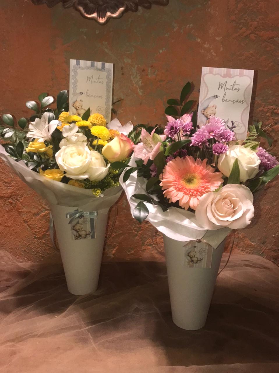 Cone de flores frescas, cone branco e papelaria personalizada de ursinho completa. Temos rosa, azul ou amarela. Um lindo e delicado presente, fofo e super prático para presentear na maternidade ou em casa a mãe e o bebê.