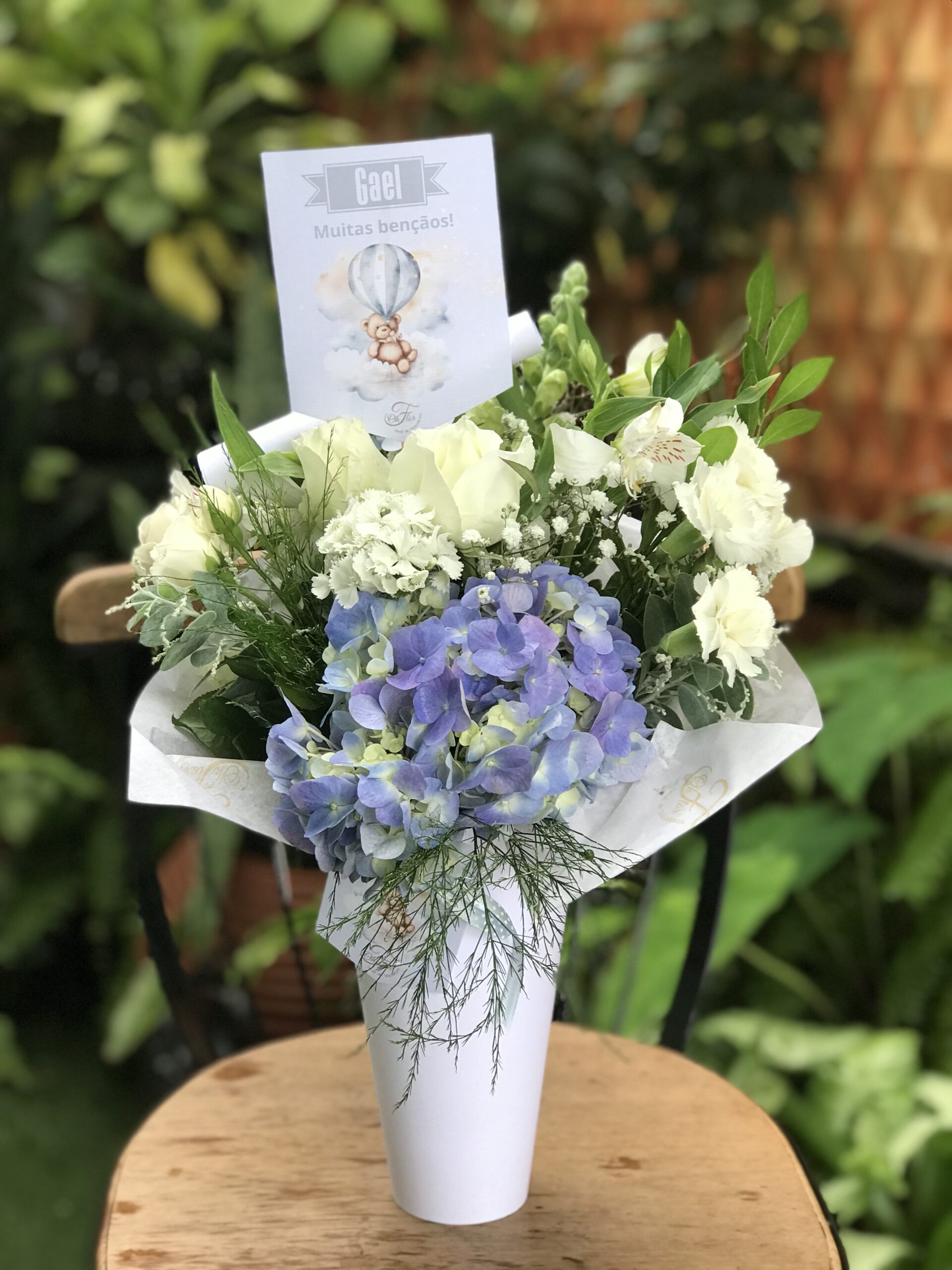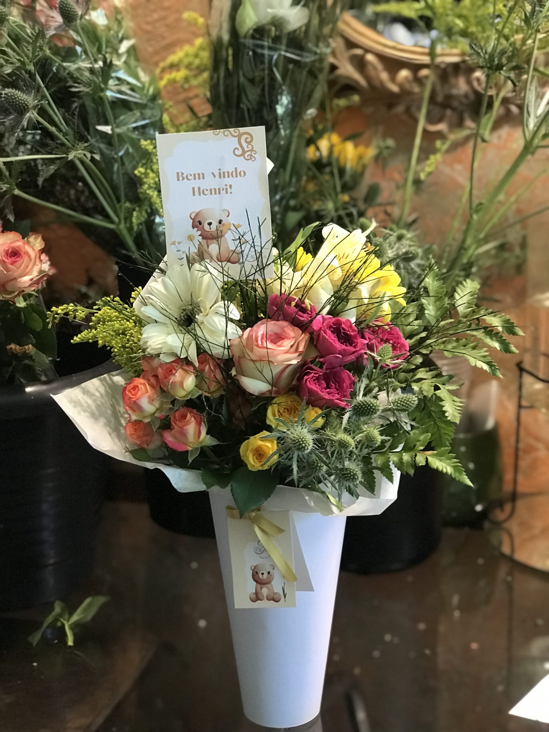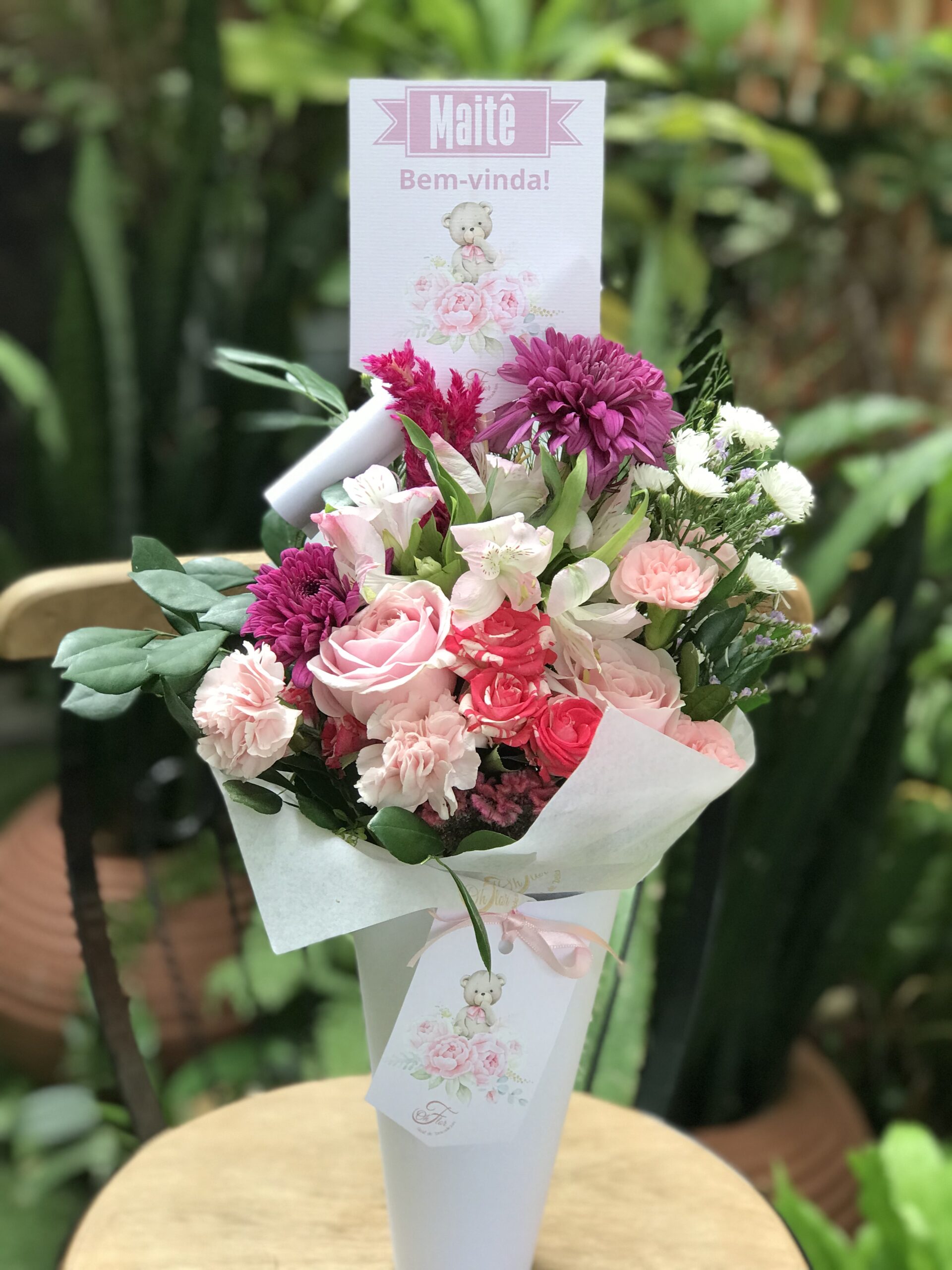 Cone de flores frescas, cone branco e papelaria personalizada de ursinho completa. Temos rosa, azul ou amarela. Um lindo e delicado presente, fofo e super prático para presentear na maternidade ou em casa a mãe e o bebê.