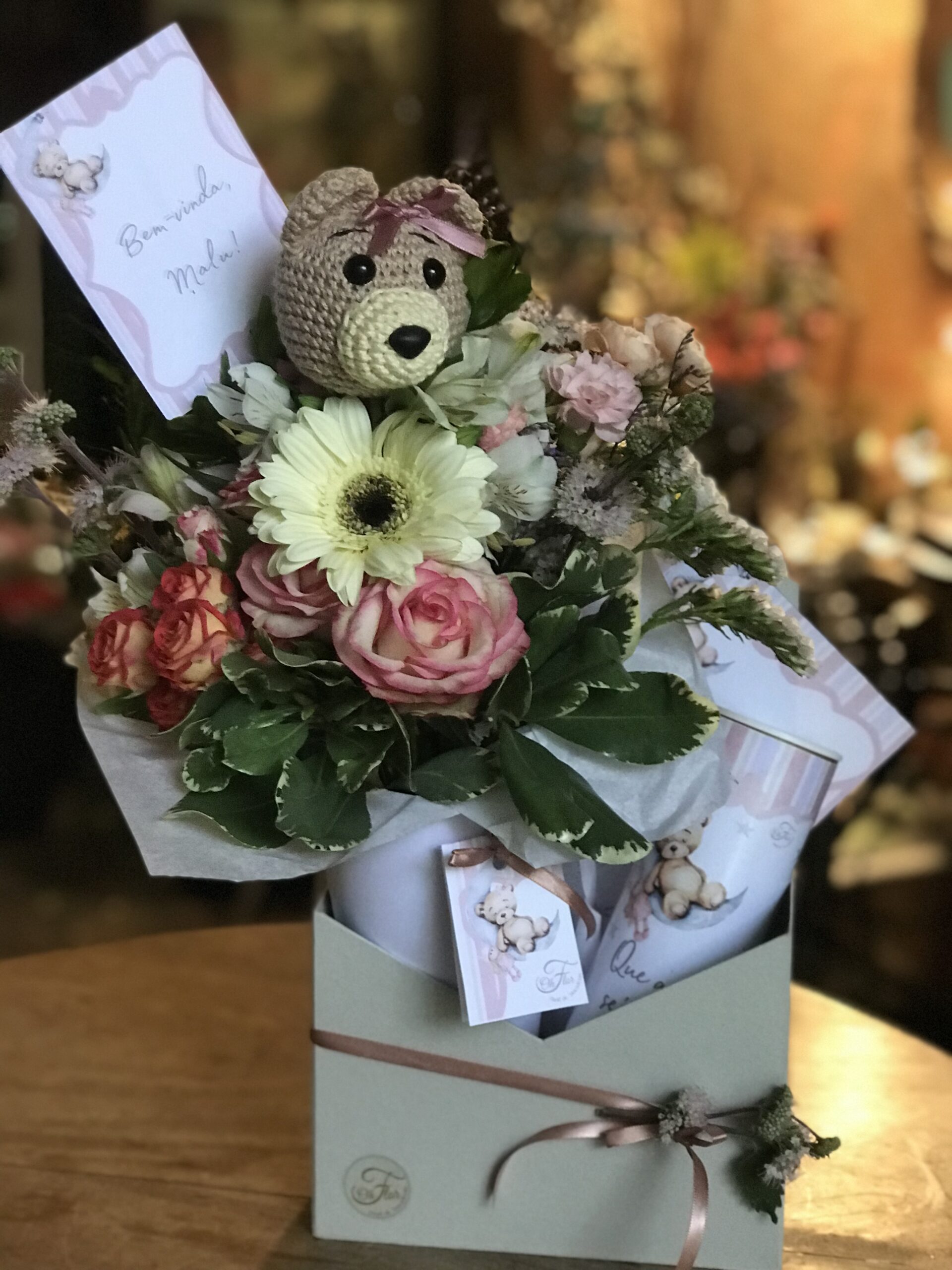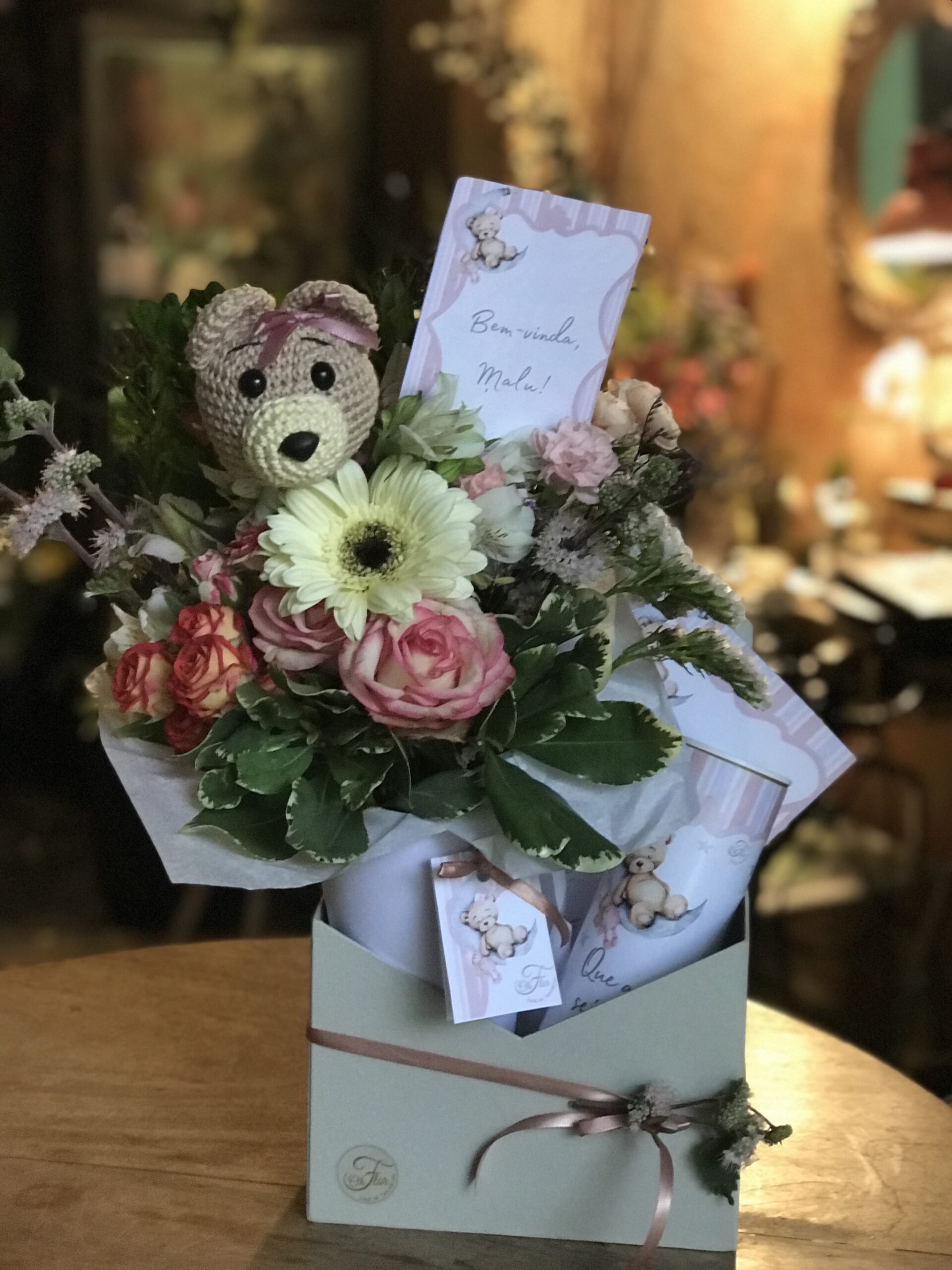 Nossa caixa em forma de envelope guarda um cone de flores frescas da semana, cuidadosamente selecionadas para encantar os olhos. Para adoçar o momento, incluímos uma latinha de chocolates italianos e um ursinho no palito, perfeitos para um agrado extra.