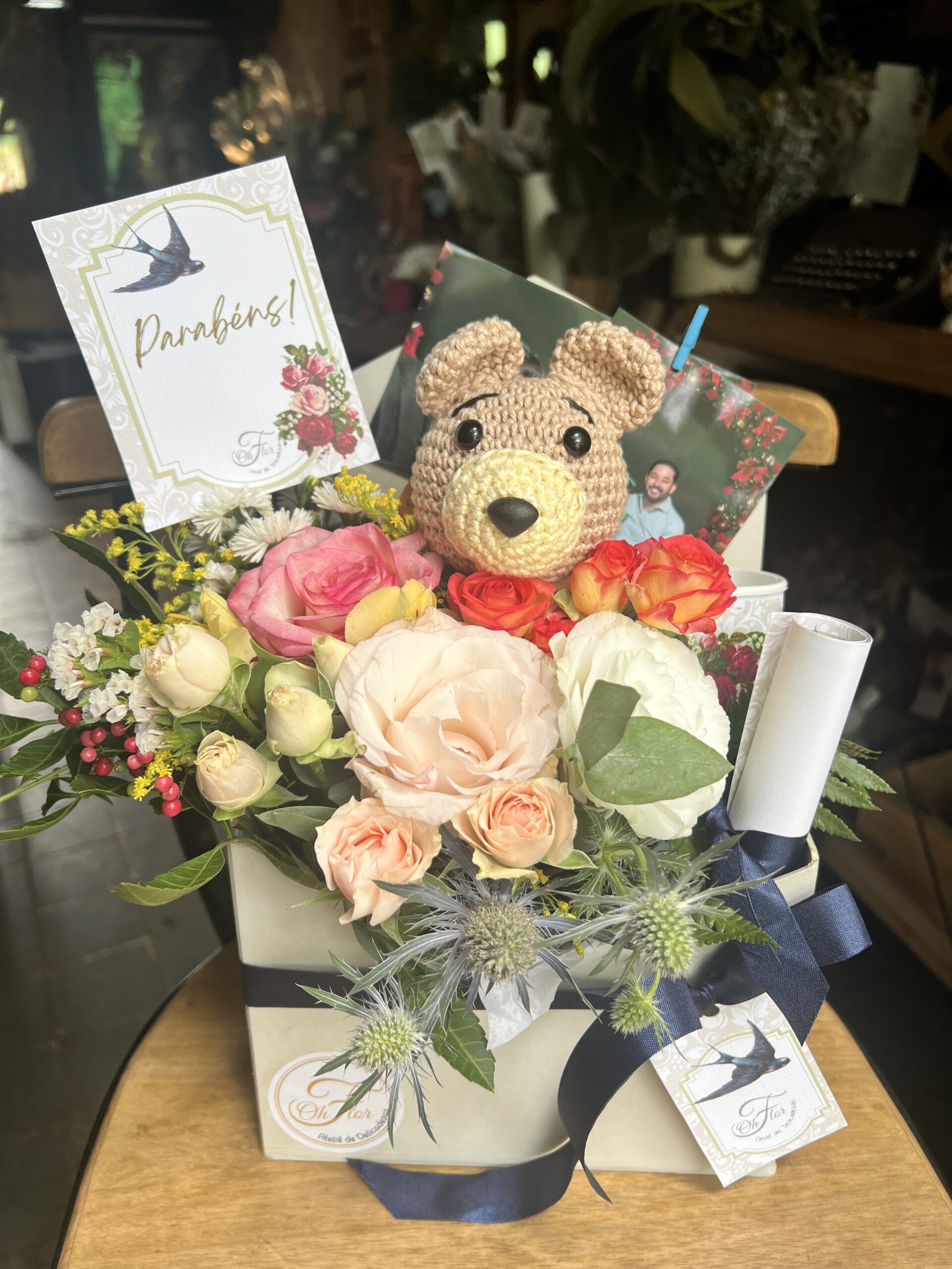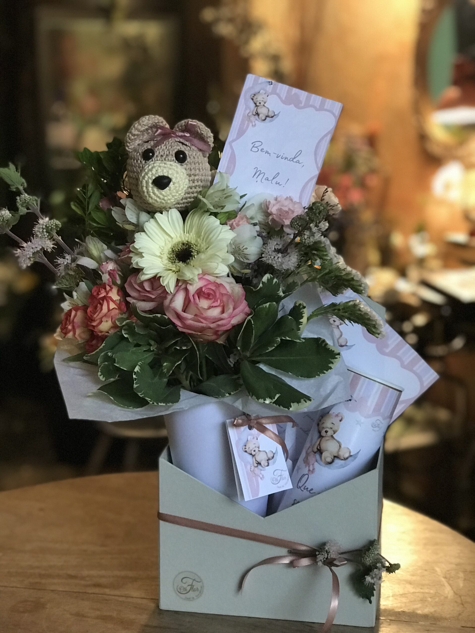 Nossa caixa em forma de envelope guarda um cone de flores frescas da semana, cuidadosamente selecionadas para encantar os olhos. Para adoçar o momento, incluímos uma latinha de chocolates com 9 bombos Ferrer Rocher e um ursinho no palito, perfeitos para um agrado extra.