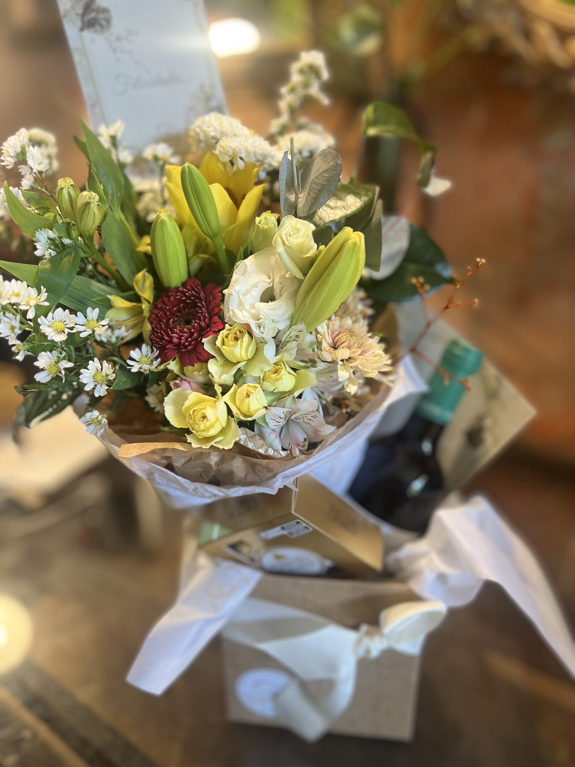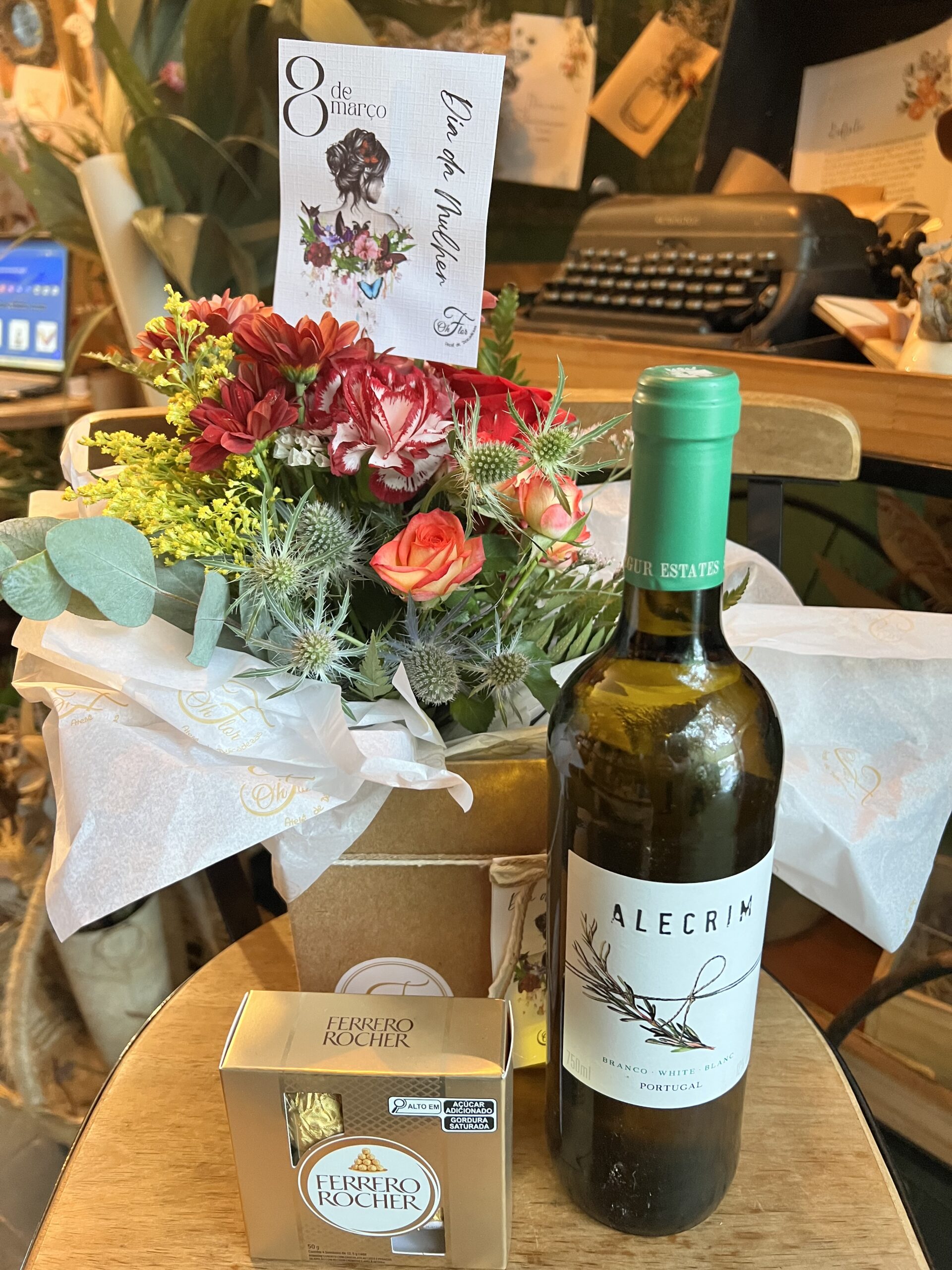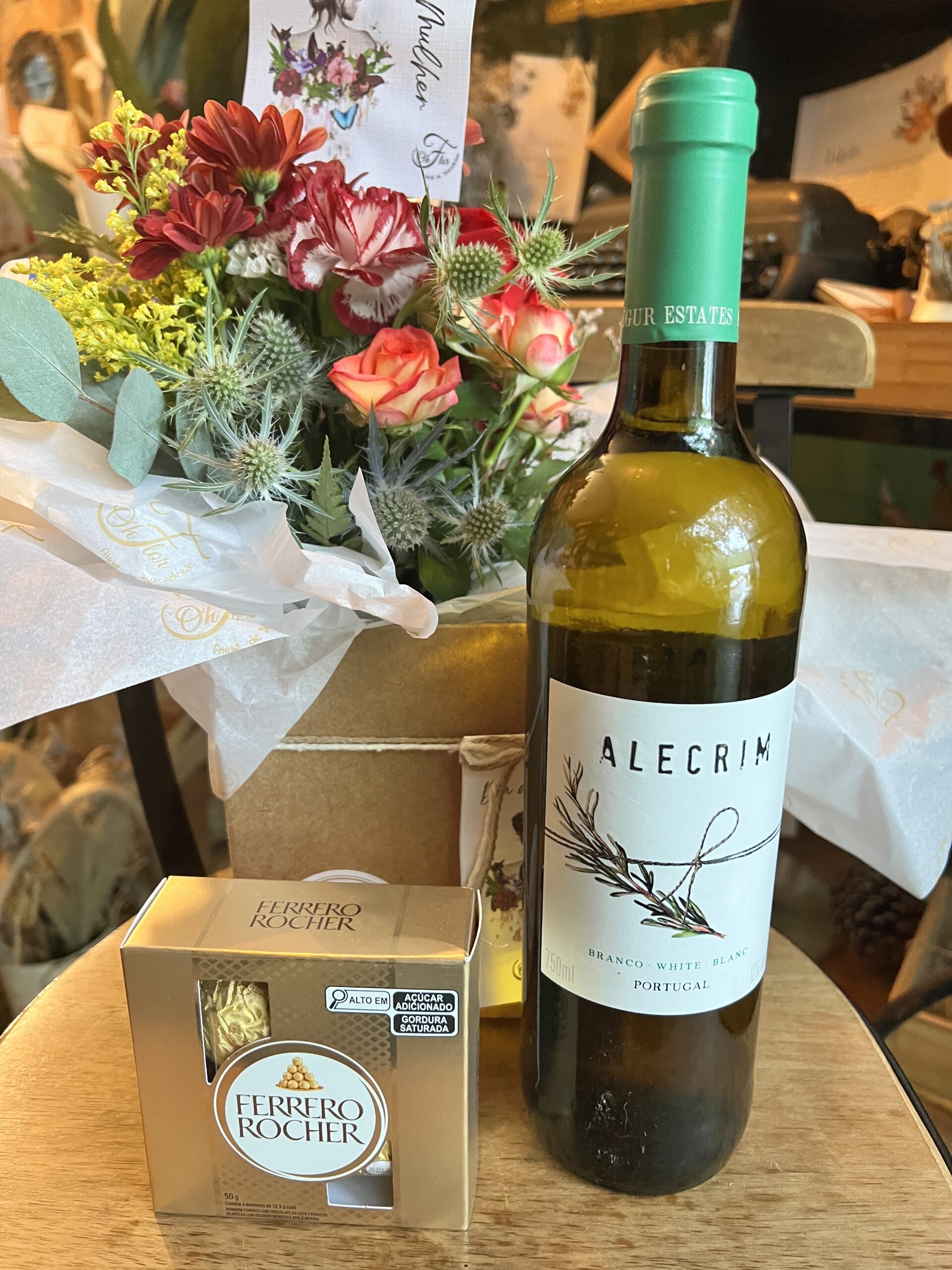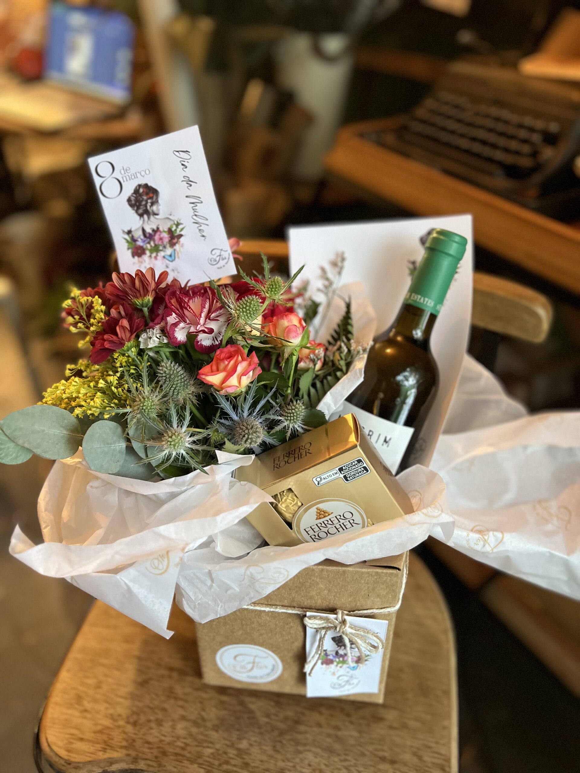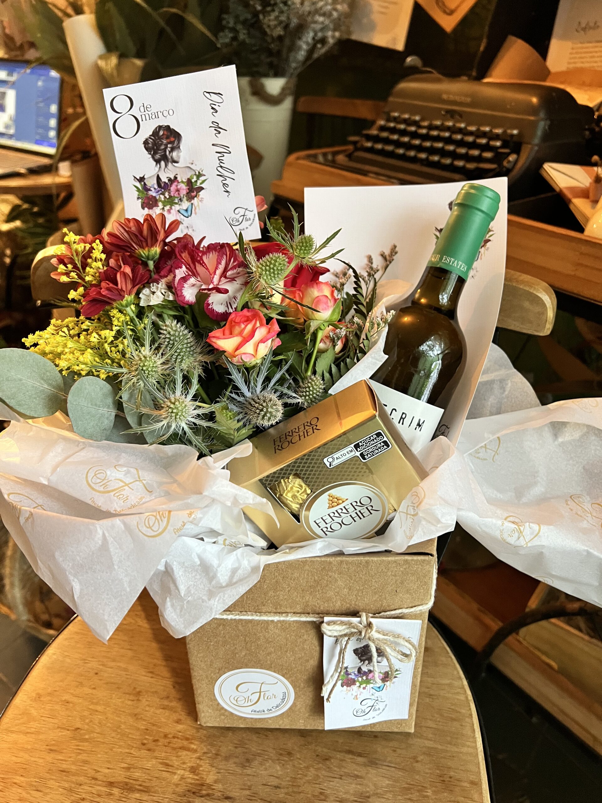 Caixa em papel kraft com flores, vinho e chocolate. Carta impressa de até 100 palavras.